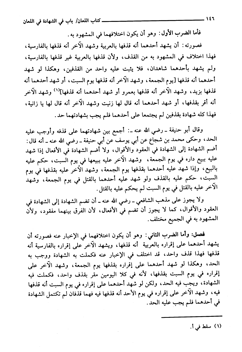 وَقَالَ أَبُو حَنِيفَةَ - رَضِيَ اللَّهُ عَنْهُ -: أَجْمَعُ بَيْنَ شَهَادَتِهِمَا عَلَى قَذْفِهِ وَأُوجِبُ عَلَيْهِ الْحَدَّ، وَحَكَى مُحَمَّدُ بْنُ شُجَاعٍ عَنْ أَبِي يُوسُفَ عَنْ أَبِي حَنِيفَةَ - رَضِيَ اللَّهُ عَنْهُ - أَنَّهُ قَالَ أَضُمُّ الشَّهَادَةَ إِلَى الشَّهَادَةِ فِي الْعُقُودِ وَالْأَقْوَالِ، وَلَا أَضُمُّ الشَّهَادَةَ فِي الْأَفْعَالِ إِذَا شَهِدَ عَلَيْهِ بِبَيْعِ دَارِهِ فِي يَوْمِ الْجُمُعَةِ، وَشَهِدَ الْآخَرُ عَلَيْهِ بِبَيْعِهَا فِي يَوْمِ السَّبْتِ، حُكِمَ عَلَيْهِ بِالْبَيْعِ، وَإِذَا شَهِدَ عَلَيْهِ أَحَدُهُمَا بِقَذْفِهَا يَوْمَ الْجُمُعَةِ، وَشَهِدَ الْآخَرُ عَلَيْهِ بِقَذْفِهَا فِي يَوْمِ السَّبْتِ، حُكِمَ عَلَيْهِ بِالْقَذْفِ وَلَوْ شَهِدَ عَلَيْهِ أَحَدُهُمَا بِالْقَتْلِ فِي يَوْمِ الْجُمُعَةِ، وَشَهِدَ الْآخَرُ عَلَيْهِ بِالْقَتْلِ فِي يَوْمِ السَّبْتِ لَمْ يُحْكَمْ عَلَيْهِ بِالْقَتْلِ.