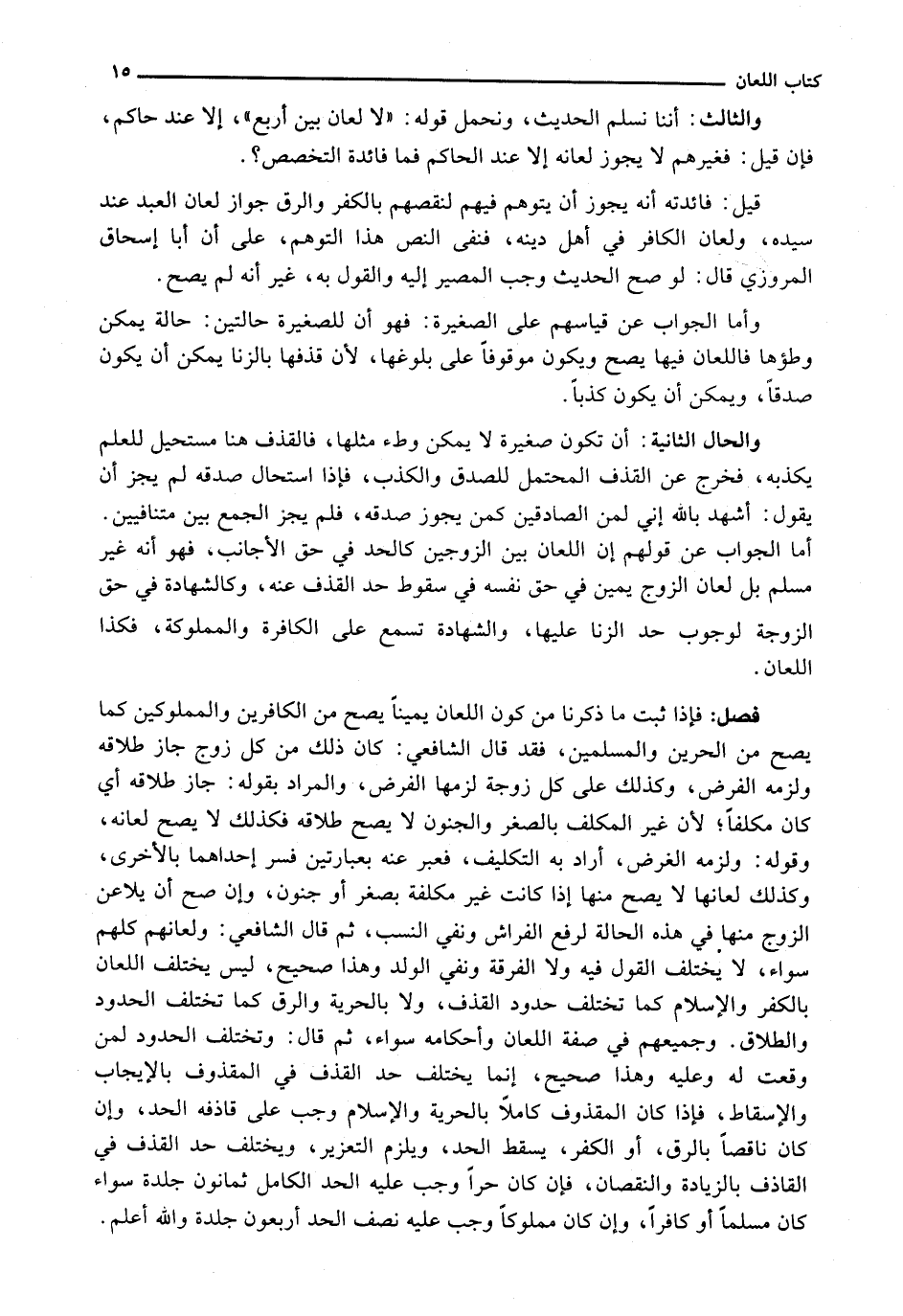 فَإِذَا ثَبَتَ مَا ذَكَرْنَا مِنْ كَوْنِ اللِّعَانِ يَمِينًا يَصِحُّ مِنَ الْكَافِرَيْنِ وَالْمَمْلُوكَيْنِ كَمَا يَصِحُّ مِنَ الْحُرَّيْنِ وَالْمُسْلِمَيْنِ، فَقَدْ قَالَ الشَّافِعِيُّ: كَانَ ذَلِكَ مِنْ كُلِّ زَوْجٍ جَازَ طَلَاقُهُ وَلَزِمَهُ الْفَرْضُ، وَكَذَلِكَ عَلَى كُلِّ زَوْجَةٍ لَزِمَهَا الْفَرْضُ، وَالْمُرَادُ بِقَوْلِهِ: جَازَ طَلَاقُهُ أَيْ كَانَ مُكَلَّفًا؛ لِأَنَّ غَيْرَ الْمُكَلَّفِ بِالصِّغَرِ وَالْجُنُونِ لَا يَصِحُّ طَلَاقُهُ فَكَذَلِكَ لَا يَصِحُّ لِعَانُهُ، وقوله: ولزمه الغرض، أَرَادَ بِهِ التَّكْلِيفَ، فَعَبَّرَ عَنْهُ بِعِبَارَتَيْنِ فَسَّرَ إِحْدَاهُمَا بِالْأُخْرَى، وَكَذَلِكَ لِعَانُهَا لَا يَصِحُّ مِنْهَا إِذَا كَانَتْ غَيْرَ مُكَلَّفَةٍ بِصِغَرٍ أَوْ جُنُونٍ، وَإِنْ صَحَّ أَنْ يُلَاعِنَ الزَّوْجُ مِنْهَا فِي هَذِهِ الْحَالَةِ لِرَفْعِ الْفِرَاشِ وَنَفْيِ النَّسَبِ، ثُمَّ قَالَ الشَّافِعِيُّ: وَلِعَانُهُمْ كُلُّهُمْ سَوَاءٌ، لَا يَخْتَلِفُ القول فيه الفرقة ونفي الولد وهذا صحيح، ليس يختلفان اللِّعَانُ بِالْكُفْرِ وَالْإِسْلَامِ كَمَا تَخْتَلِفُ حُدُودُ الْقَذْفِ، وَلَا بِالْحُرِّيَّةِ وَالرِّقِّ كَمَا تَخْتَلِفُ الْحُدُودُ وَالطَّلَاقُ. وَجَمِيعُهُمْ فِي صِفَةِ اللِّعَانِ وَأَحْكَامِهِ سَوَاءٌ، ثُمَّ قَالَ: وَتَخْتَلِفُ الْحُدُودُ لِمَنْ وَقَعَتْ لَهُ وَعَلَيْهِ وَهَذَا صَحِيحٌ، إِنَّمَا يَخْتَلِفُ حَدُّ الْقَذْفِ فِي الْمَقْذُوفِ بِالْإِيجَابِ وَالْإِسْقَاطِ، فَإِذَا كَانَ الْمَقْذُوفُ كَامِلًا بِالْحُرِّيَّةِ وَالْإِسْلَامِ وَجَبَ عَلَى قَاذِفِهِ الْحَدُّ، وَإِنْ كَانَ نَاقِصًا بِالرِّقِّ، أَوِ الْكُفْرِ يَسْقُطُ الْحَدُّ، وَيَلْزَمُ التَّعْزِيرُ، وَيَخْتَلِفُ حَدُّ الْقَذْفِ فِي الْقَاذِفِ بِالزِّيَادَةِ وَالنُّقْصَانِ، فَإِنْ كَانَ حُرًّا وَجَبَ عَلَيْهِ الْحَدُّ الْكَامِلُ ثَمَانُونَ جَلْدَةً سَوَاءٌ كَانَ مُسْلِمًا أَوْ كَافِرًا، وَإِنْ كَانَ مَمْلُوكًا وَجَبَ عَلَيْهِ نصف الحد أربعون جلدة والله أعلم.