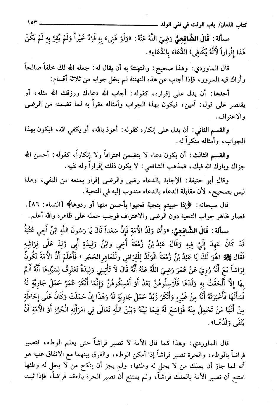 قال الشافعي: " وَأَمَّا وَلَدُ الْأَمَةِ فَإِنَّ سَعْدًا قَالَ يَا رَسُولَ اللَّهِ ابْنُ أَخِي عُتْبَةَ قَدْ كَانَ عَهِدَ إِلَيَّ فِيهِ وَقَالَ عَبْدُ بْنُ زَمْعَةَ أَخِي وَابْنُ وَلِيدَةِ أبي ولد على فراشه فقال - صَلَّى اللَّهُ عَلَيْهِ وَسَلَّم َ - " هُوَ لَكَ يَا عَبْدُ بْنَ زَمْعَةَ الْوَلَدُ للفراش وللعاهر الحجر " فأعلم أن الأمة تكون فراشاً مع أنه رَوَى عَنْ عُمَرَ رَضِيَ اللَّهُ عَنْهُ أَنَّهُ قال لا تأتيني وليدة تعترف لسيدها أنه أَلَمَّ بِهَا إِلَّا أَلْحَقْتُ بِهِ وَلَدَهَا فَأَرْسِلُوهُنَّ بعد أو أمسكوهن وإنما أنكر عمر حمل جارية له فسألها فأخبرته أنه من غيره وأنكر زيد حمل جارية له وهذا إن حملت وكان على إحاطة من أنها من تحمل منه فواسع له فيما بينه وبين الله تعالى في امرأته الحرة أو الأمة إن ينفى ولدها ".