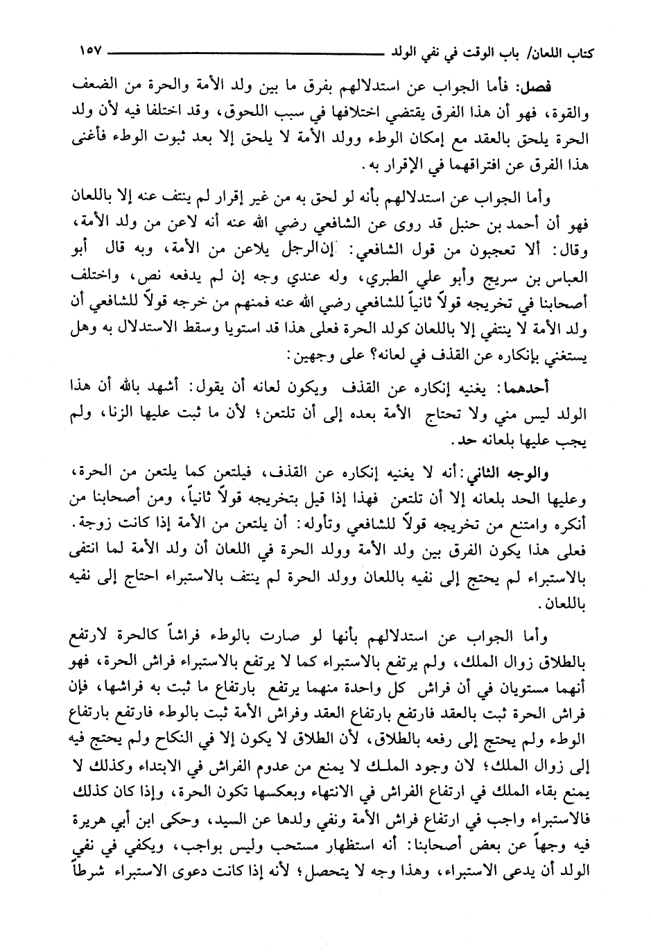 وَأَمَّا الْجَوَابُ عَنِ اسْتِدْلَالِهِمْ بِأَنَّهُ لَوْ لَحِقَ بِهِ مِنْ غَيْرِ إِقْرَارٍ لَمْ يَنْتَفِ عَنْهُ إِلَّا بِاللِّعَانِ فَهُوَ أَنَّ أَحْمَدَ بْنَ حَنْبَلٍ قَدْ رَوَى عَنِ الشَّافِعِيِّ رَضِيَ اللَّهُ عَنْهُ أَنَّهُ لَاعَنَ مِنْ وَلَدِ الْأَمَةِ، وَقَالَ: أَلَا تَعْجَبُونَ مِنْ قَوْلِ الشَّافِعِيِّ: إِنَّ الرَّجُلَ يُلَاعِنُ مِنَ الْأَمَةِ، وَبِهِ قَالَ أَبُو الْعَبَّاسِ بْنُ سُرَيْجٍ وَأَبُو عَلِيٍّ الطَّبَرِيُّ، وَلَهُ عِنْدِي وَجْهٌ إِنْ لَمْ يَدْفَعْهُ نَصٌّ، وَاخْتَلَفَ أَصْحَابُنَا فِي تَخْرِيجِهِ قَوْلًا ثَانِيًا لِلشَّافِعِيِّ رَضِيَ اللَّهُ عَنْهُ فَمِنْهُمْ مَنْ خَرَّجَهُ قَوْلًا لِلشَّافِعِيِّ أَنَّ وَلَدَ الْأَمَةِ لَا يَنْتَفِي إِلَّا بِاللِّعَانِ كَوَلَدِ الْحُرَّةِ فَعَلَى هَذَا قَدِ اسْتَوَيَا وَسَقَطَ الِاسْتِدْلَالُ بِهِ وَهَلْ يَسْتَغْنِي بِإِنْكَارِهِ عَنِ الْقَذْفِ فِي لِعَانِهِ؟ عَلَى وَجْهَيْنِ: