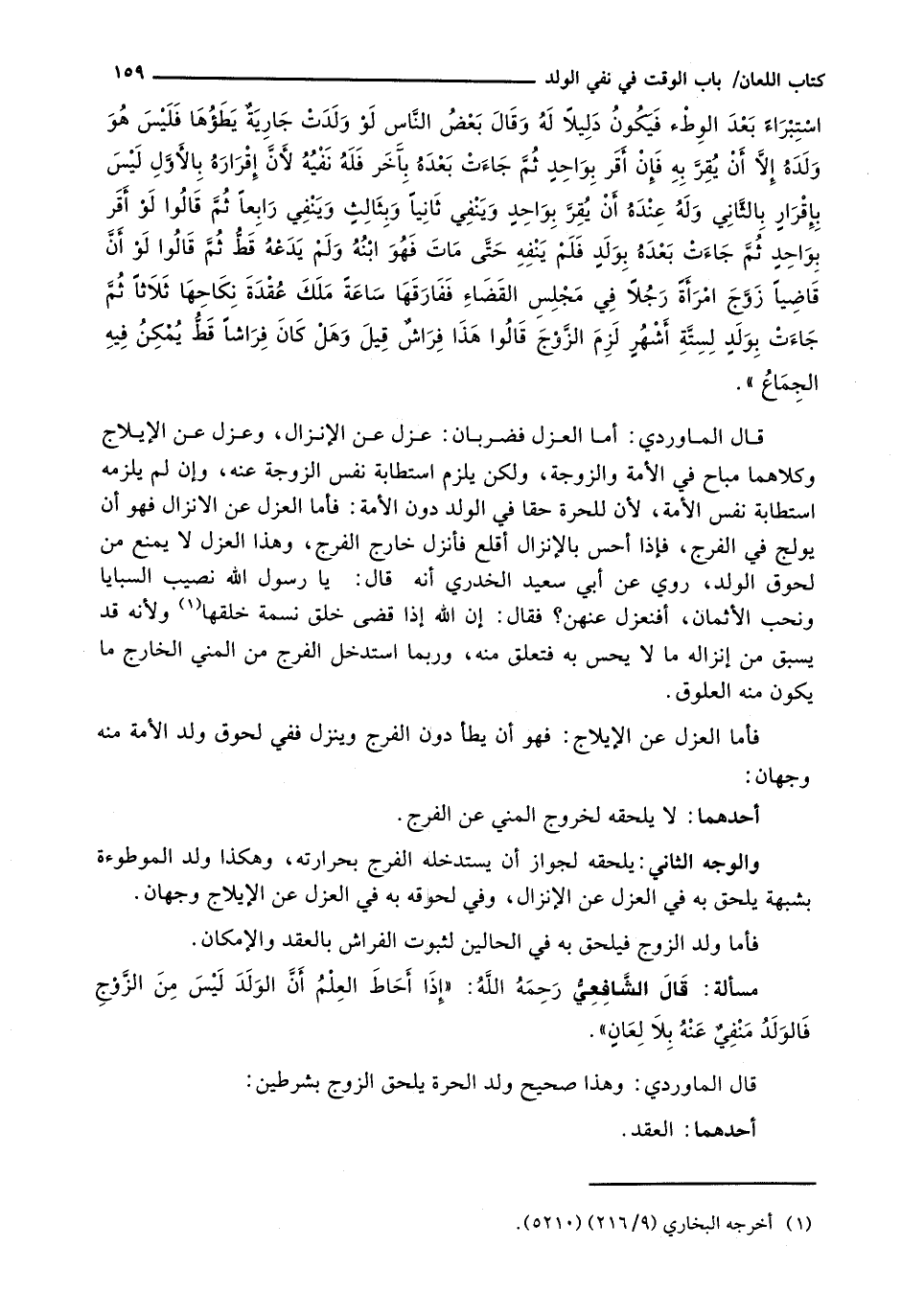 قَالَ الْمَاوَرْدِيُّ: أَمَّا الْعَزْلُ فَضَرْبَانِ: عَزْلٌ عَنِ الْإِنْزَالِ، وَعَزْلٌ عَنِ الْإِيلَاجِ وَكِلَاهُمَا مُبَاحٌ فِي الْأَمَةِ وَالزَّوْجَةِ، وَلَكِنْ يَلْزَمُ اسْتِطَابَةُ نَفْسِ الزَّوْجَةِ عَنْهُ، وَإِنْ لَمْ يَلْزَمْهُ اسْتِطَابَةُ نَفْسِ الْأَمَةِ، لِأَنَّ لِلْحُرَّةِ حَقًّا فِي الْوَلَدِ دُونَ الْأَمَةِ: فَأَمَّا الْعَزْلُ عَنِ الْإِنْزَالِ فَهُوَ أَنْ يُولِجَ فِي الْفَرْجِ، فَإِذَا أَحَسَّ بِالْإِنْزَالِ أَقْلَعَ فَأَنْزَلَ خَارِجَ الْفَرْجِ، وَهَذَا الْعَزْلُ لَا يَمْنَعُ مِنْ لُحُوقِ الْوَلَدِ، رُوِيَ عَنْ أَبِي سَعِيدٍ الْخُدْرِيِّ أَنَّهُ قَالَ: يَا رَسُولَ اللَّهِ - صَلَّى اللَّهُ عَلَيْهِ وَسَلَّم َ - نُصِيبُ السَّبَايَا وَنُحِبُّ الْأَثْمَانَ، أَفَنَعْزِلُ عَنْهُنَّ؟ فَقَالَ: إِنَّ اللَّهَ إِذَا قَضَى خَلْقَ نَسَمَةٍ خَلَقَهَا وَلِأَنَّهُ قَدْ يَسْبِقُ مِنْ إِنْزَالِهِ مَا لَا يُحِسُّ بِهِ فَتَعَلَّقَ مِنْهُ، وَرُبَّمَا اسْتَدْخَلَ الْفَرْجُ مِنَ الْمَنِيِّ الْخَارِجِ مَا يَكُونُ مِنْهُ الْعُلُوقُ.