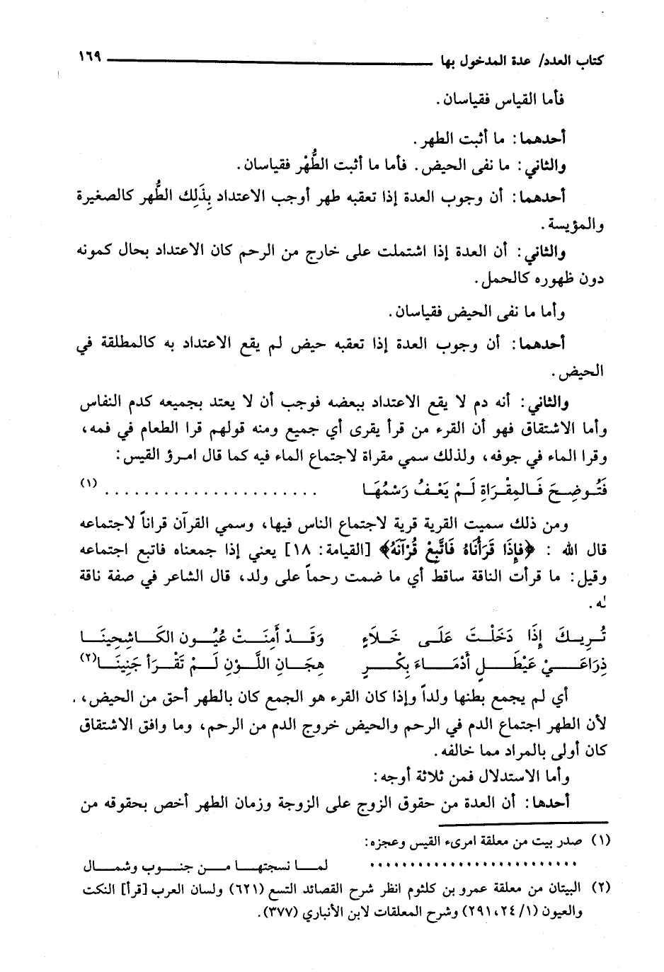 وَالثَّانِي: أَنَّهُ دَمٌ لَا يَقَعُ الِاعْتِدَادُ بِبَعْضِهِ فَوَجَبَ أَنْ لَا يُعْتَدَّ بِجَمِيعِهِ كَدَمِ النِّفَاسِ وَأَمَّا الِاشْتِقَاقُ فَهُوَ أَنَّ الْقُرْءَ مِنْ قرأ يقرى أي جميع وَمِنْهُ قَوْلُهُمْ قَرَا الطَّعَامَ فِي فَمِهِ، وَقَرَا الْمَاءَ فِي جَوْفِهِ، وَلِذَلِكَ سُمِّيَ مَقْرَاةً لِاجْتِمَاعِ الْمَاءِ فِيهِ كَمَا قَالَ امْرُؤُ الْقَيْسِ:
