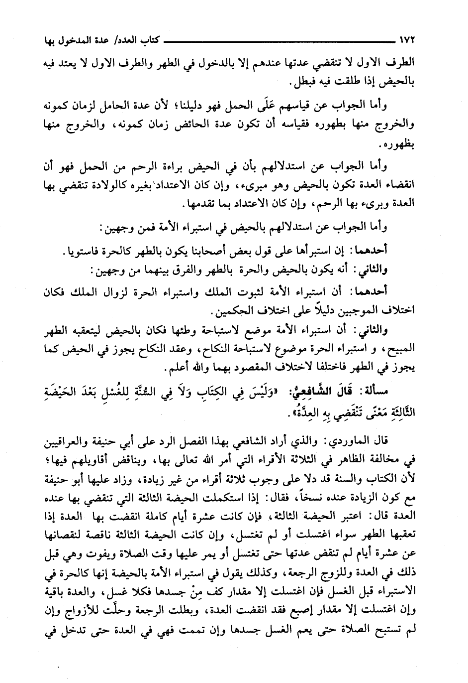 قال الماوردي: والذي أراد الشافعي بِهَذَا الْفَصْلِ الرَّدُّ عَلَى أَبِي حَنِيفَةَ وَالْعِرَاقِيِّينَ فِي مُخَالَفَةِ الظَّاهِرِ فِي الثَّلَاثَةِ الْأَقْرَاءِ الَّتِي أمر الله تعالى بها، ويناقض أَقَاوِيلِهِمْ فِيهَا؛ لِأَنَّ الْكِتَابَ وَالسُّنَّةَ قَدْ دَلَّا عَلَى وُجُوبِ ثَلَاثَةِ أَقْرَاءٍ مِنْ غَيْرِ زِيَادَةٍ، وَزَادَ عَلَيْهَا أَبُو حَنِيفَةَ مَعَ كَوْنِ الزِّيَادَةِ عِنْدَهُ نَسْخًا، فَقَالَ: إِذَا اسْتَكْمَلَتِ الْحَيْضَةَ الثَّالِثَةَ الَّتِي تَنْقَضِي بِهَا عِنْدَهُ الْعِدَّةُ قَالَ: اعْتَبَرَ الْحَيْضَةَ الثَّالِثَةَ، فَإِنْ كَانَتْ عَشْرَةَ أَيَّامٍ كَامِلَةً انْقَضَتْ بِهَا الْعِدَّةُ إِذَا تَعَقَّبَهَا الطُّهْرُ سَوَاءٌ اغْتَسَلَتْ أَوْ لَمْ تَغْتَسِلْ، وَإِنْ كَانَتِ الْحَيْضَةُ الثَّالِثَةُ نَاقِصَةً لِنُقْصَانِهَا عَنْ عَشْرَةِ أَيَّامٍ لَمْ تَنْقَضِ عِدَّتُهَا حَتَّى تَغْتَسِلَ أَوْ يَمُرَّ عَلَيْهَا وَقْتُ الصَّلَاةِ وَيَفُوتَ وَهِيَ قَبْلَ ذَلِكَ فِي الْعِدَّةِ وَلِلزَّوْجِ الرَّجْعَةُ، وَكَذَلِكَ يَقُولُ فِي اسْتِبْرَاءِ الْأَمَةِ بِالْحَيْضَةِ إِنَّهَا كَالْحُرَّةِ فِي الِاسْتِبْرَاءِ قَبْلَ الْغُسْلِ فَإِنِ اغْتَسَلَتْ إِلَّا مِقْدَارَ كَفٍّ مِنْ جسدها فكلا غُسْلَ، وَالْعِدَّةُ بَاقِيَةٌ وَإِنِ اغْتَسَلَتْ إِلَّا مِقْدَارَ أُصْبُعٍ فَقَدِ انْقَضَتِ الْعِدَّةُ، وَبَطَلَتِ الرَّجْعَةُ وَحَلَّتْ لِلْأَزْوَاجِ وَإِنْ لَمْ تَسْتَبِحِ الصَّلَاةَ حَتَّى يَعُمَّ الغسل جسدها وإن تممت فَهِيَ فِي الْعِدَّةِ حَتَّى تَدْخُلَ فِي