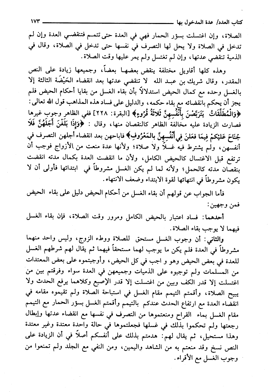 وَهَذِهِ كُلُّهَا أَقَاوِيلُ مُخْتَلِفَةٌ يَنْقُضُ بَعْضُهَا بَعْضًا، وَجَمِيعُهَا زِيَادَةٌ عَلَى النَّصِّ الْمُقَدَّرِ، وَقَالَ شَرِيكُ بْنُ عَبْدِ اللَّهِ لَا تَنْقَضِي عِدَّتُهَا بَعْدَ انْقِضَاءِ الْحَيْضَةِ الثَّالِثَةِ إِلَّا بِالْغُسْلِ وَحْدَهُ مَعَ كَمَالِ الْحَيْضِ اسْتِدْلَالًا بِأَنَّ بَقَاءَ الْغُسْلِ مِنْ بَقَايَا أَحْكَامِ الْحَيْضِ فَلَمْ يَجُزْ أَنْ يُحْكَمَ بِانْقِضَائِهِ مَعَ بَقَاءِ حُكْمِهِ، وَالدَّلِيلُ عَلَى فَسَادِ هَذِهِ الْمَذَاهِبِ قَوْلُ اللَّهُ تَعَالَى: {وَالْمُطَلَّقَاتُ يَتَرَبَّصْنَ بِأَنْفُسِهِنَّ ثَلاثَةَ قُرُوءٍ} [البقرة: 228] فَفِي الظَّاهِرِ وُجُوبُ غَيْرِهَا فَصَارَتِ الزِّيَادَةُ عَلَيْهِ مُخَالِفَةً الظاهر كالنقصان منها، وقال: {وإذا بَلَغْنَ أَجَلَهُنَّ فَلا جُنَاحَ عَلَيْكُمْ فِيمَا فَعَلْنَ فِي أَنْفُسِهِنَّ بالمعروف} فَأَبَاحَهُنَّ بَعْدَ انْقِضَاءِ أَجَلِهِنَّ التَّصَرُّفَ فِي أَنْفُسِهِنَّ، وَلَمْ يَشْتَرِطْ فِيهِ غُسْلًا وَلَا صَلَاةً؛ وَلِأَنَّهَا عِدَّةٌ مَنَعَتْ مِنَ الْأَزْوَاجِ فَوَجَبَ أَنْ تَرْتَفِعَ قَبْلَ الِاغْتِسَالِ كَالْحَيْضِ الْكَامِلِ، وَلِأَنَّ مَا انْقَضَتِ الْعِدَّةُ بِكَمَالِ مُدَّتِهِ انْقَضَتْ بِنُقْصَانِ مُدَّتِهِ كَالْحَمْلِ؛ وَلِأَنَّهُ لَمَّا لَمْ يَكُنِ الْغُسْلُ مَشْرُوطًا فِي ابْتِدَائِهَا فَأَوْلَى أَنْ لَا يَكُونَ مَشْرُوطًا فِي انْتِهَائِهَا لِقُوَّةِ الِابْتِدَاءِ وَضَعْفِ الِانْتِهَاءِ.