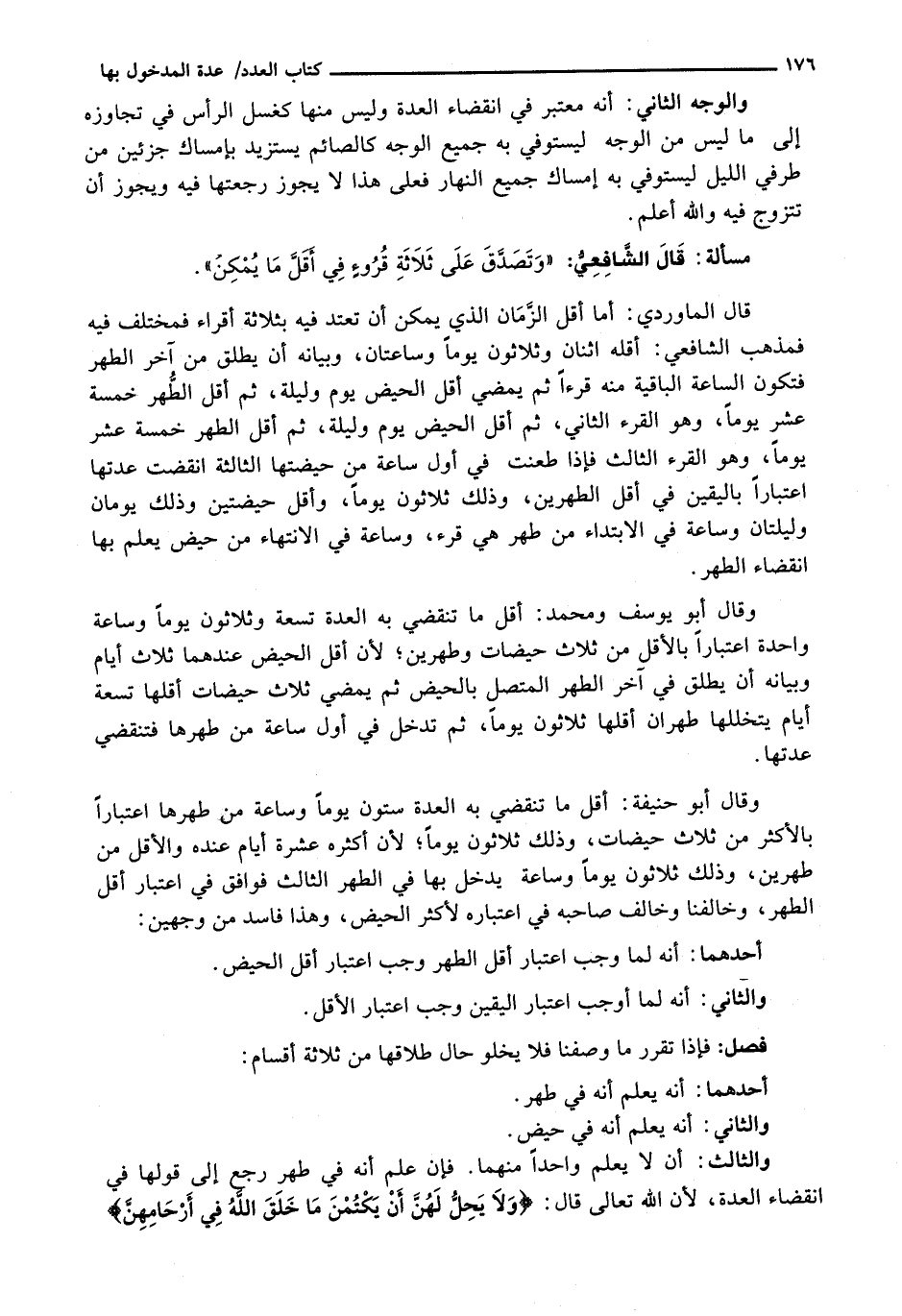 قَالَ الْمَاوَرْدِيُّ: أَمَا أَقَلُّ الزَّمَانِ الَّذِي يُمْكِنُ أَنْ تَعْتَدَّ فِيهِ بِثَلَاثَةِ أَقَرَاءٍ فَمُخْتَلَفٌ فِيهِ فَمَذْهَبُ الشَّافِعِيِّ: أَقَلُّهُ اثْنَانِ وَثَلَاثُونَ يَوْمًا وَسَاعَتَانِ، وَبَيَانُهُ أَنْ يُطَلِّقَ مِنْ آخِرِ الطُّهْرِ فَتَكُونُ السَّاعَةُ الْبَاقِيَةُ مِنْهُ قُرْءًا ثُمَّ يَمْضِي أَقَلُّ الْحَيْضِ يَوْمٌ وَلَيْلَةٌ، ثُمَّ أَقَلُّ الطُّهْرِ خَمْسَةَ عَشَرَ يَوْمًا، وَهُوَ الْقُرْءُ الثَّانِي، ثُمَّ أَقَلُّ الْحَيْضِ يَوْمٌ وَلَيْلَةٌ، ثُمَّ أَقَلُّ الطُّهْرِ خَمْسَةَ عَشَرَ يَوْمًا، وَهُوَ الْقُرْءُ الثَّالِثُ فَإِذَا طَعَنَتْ فِي أَوَّلِ سَاعَةٍ مِنْ حَيْضَتِهَا الثَّالِثَةِ انْقَضَتْ عِدَّتُهَا اعْتِبَارًا بِالْيَقِينِ فِي أَقَلِّ الطُّهْرَيْنِ، وَذَلِكَ ثَلَاثُونَ يَوْمًا، وَأَقَلِّ حَيْضَتَيْنِ وَذَلِكَ يَوْمَانِ وَلَيْلَتَانِ وَسَاعَةٌ فِي الِابْتِدَاءِ مِنْ طُهْرٍ هِيَ قُرْءٌ، وَسَاعَةٌ فِي الِانْتِهَاءِ مِنْ حَيْضٍ يُعْلَمُ بِهَا انْقِضَاءُ الطُّهْرِ.