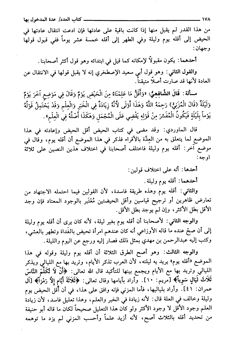 وَالْوَجْهُ الثَّالِثُ: وَهُوَ أَصَحُّ الطُّرُقِ الثَّلَاثَةِ أَنَّ أَقَلَّهُ يَوْمٌ وَلَيْلَةٌ وَقَوْلُهُ فِي هَذَا الموضع " أقله يوم " يريد يه لَيْلَتَهُ، لِأَنَّ الْعَرَبَ تَذْكُرُ الْأَيَّامَ، وَتُرِيدُ بِهَا مع الليالي ويذكر اللَّيَالِيَ وَتُرِيدُ بِهَا مَعَ الْأَيَّامِ وَيُجْمَعُ بَيْنَهَا للتأكيد قال الله تعالى: {أن لا تُكَلِّمَ النَّاسَ ثَلاثَ لَيَالٍ سَوِيًّا} [مريم: 10] . وَأَرَادَ بِأَيَّامِهَا وَقَالَ تَعَالَى: {ثَلاثَةَ أَيَّامٍ إِلا رَمْزًا} [آل عمران: 41] . وَأَرَادَ بِلَيَالِيهَا، فَأَمَّا الْمُزَنِيُّ فَإِنَّهُ وَافَقَ عَلَى هَذَا، فِي أَنَّ أَقَلَّ الْحَيْضِ يَوْمٌ وَلَيْلَةٌ وَخَالَفَ فِي الْعِلَّةِ قَالَ: لِأَنَّهُ زِيَادَةٌ فِي الْخَبَرِ وَالْعِلْمِ، وَهَذَا تَعْلِيلٌ فَاسِدٌ، لِأَنَّ زِيَادَةَ الْعِلْمِ وُجُودُ الْأَقَلِّ لَا وُجُودُ الْأَكْثَرِ وَلَوْ كَانَ هَذَا التَّعْلِيلُ صَحِيحًا لَكَانَ مَا قَالَهُ أَبُو حَنِيفَةَ مِنْ تَحْدِيدِ أَقَلِّهِ بِالثَّلَاثِ أَصَحُّ، لِأَنَّهُ أَزْيَدُ عِلْمًا وَأَحْسَبُ الْمُزَنِيَّ لَمْ يَزِدْ مَا تَوَهَّمَهُ