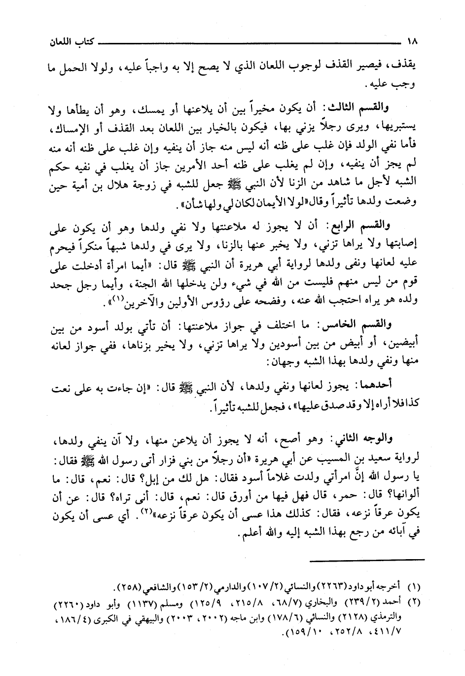 وَالْقِسْمُ الرَّابِعُ: أَنْ لَا يَجُوزَ لَهُ مُلَاعَنَتُهَا وَلَا نَفْيُ وَلَدِهَا وَهُوَ أَنْ يَكُونَ عَلَى إِصَابَتِهَا وَلَا يَرَاهَا تَزْنِي، وَلَا يُخْبَرُ عَنْهَا بِالزِّنَا، وَلَا يَرَى فِي وَلَدِهَا شَبَهًا مُنْكَرًا فَيَحْرُمُ عَلَيْهِ لِعَانُهَا وَنَفْيُ وَلَدِهَا لِرِوَايَةِ أَبِي هُرَيْرَةَ أَنَّ النَّبِيَّ - صَلَّى اللَّهُ عَلَيْهِ وَسَلَّم َ - قَالَ: " أَيُّمَا امْرَأَةٍ أَدْخَلَتْ عَلَى قَوْمٍ مَنْ لَيْسَ مِنْهُمْ فَلَيْسَتْ مِنَ اللَّهِ فِي شَيْءٍ وَلَنْ يُدْخِلَهَا اللَّهُ الْجَنَّةَ، وَأَيُّمَا رَجُلٍ جَحَدَ وَلَدَهُ هُوَ يَرَاهُ احْتَجَبَ اللَّهُ عَنْهُ، وَفَضَحَهُ عَلَى رُؤوسِ الْأَوَّلِينَ وَالْآخِرِينَ ".