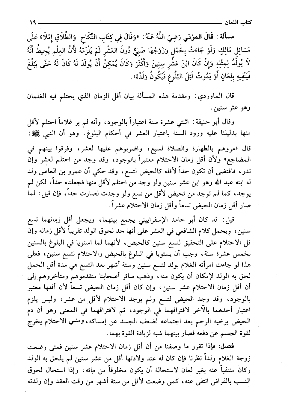 قال المزني رضي الله عنه: " وَقَالَ فِي كِتَابِ النِّكَاحِ وَالطَّلَاقِ إِمْلَاءً عَلَى مَسَائِلِ مَالِكٍ وَلَوْ جَاءَتْ بِحَمْلٍ وَزَوْجُهَا صَبِيٌّ دُونَ الْعَشْرِ لَمْ يَلْزَمْهُ لِأَنَّ الْعِلْمَ يُحِيطُ أَنَّهُ لَا يُولَدُ لِمِثْلِهِ وَإِنْ كَانَ ابْنَ عَشْرِ سِنِينَ وَأَكْثَرَ وَكَانَ يُمْكِنُ أَنْ يُولَدَ لَهُ كَانَ لَهُ حَتَّى يَبْلُغَ فَيَنْفِيَهُ بِلِعَانٍ أَوْ يَمُوتَ قَبْلَ الْبُلُوغِ فَيَكُونَ وَلَدَهُ ".