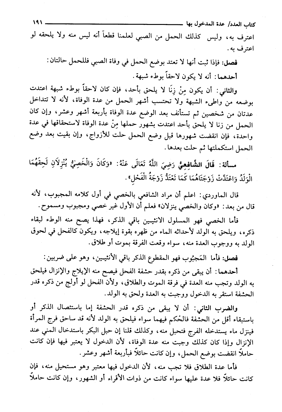 قَالَ الشافعي رضي الله تعالى عنه: " وَكَانَ وَالْخَصِيُّ يُنْزِلَانِ لَحِقَهُمَا الْوَلَدُ وَاعْتَدَّتْ زَوْجَتَاهُمَا كَمَا تَعْتَدُّ زَوْجَةُ الْفَحْلِ ".