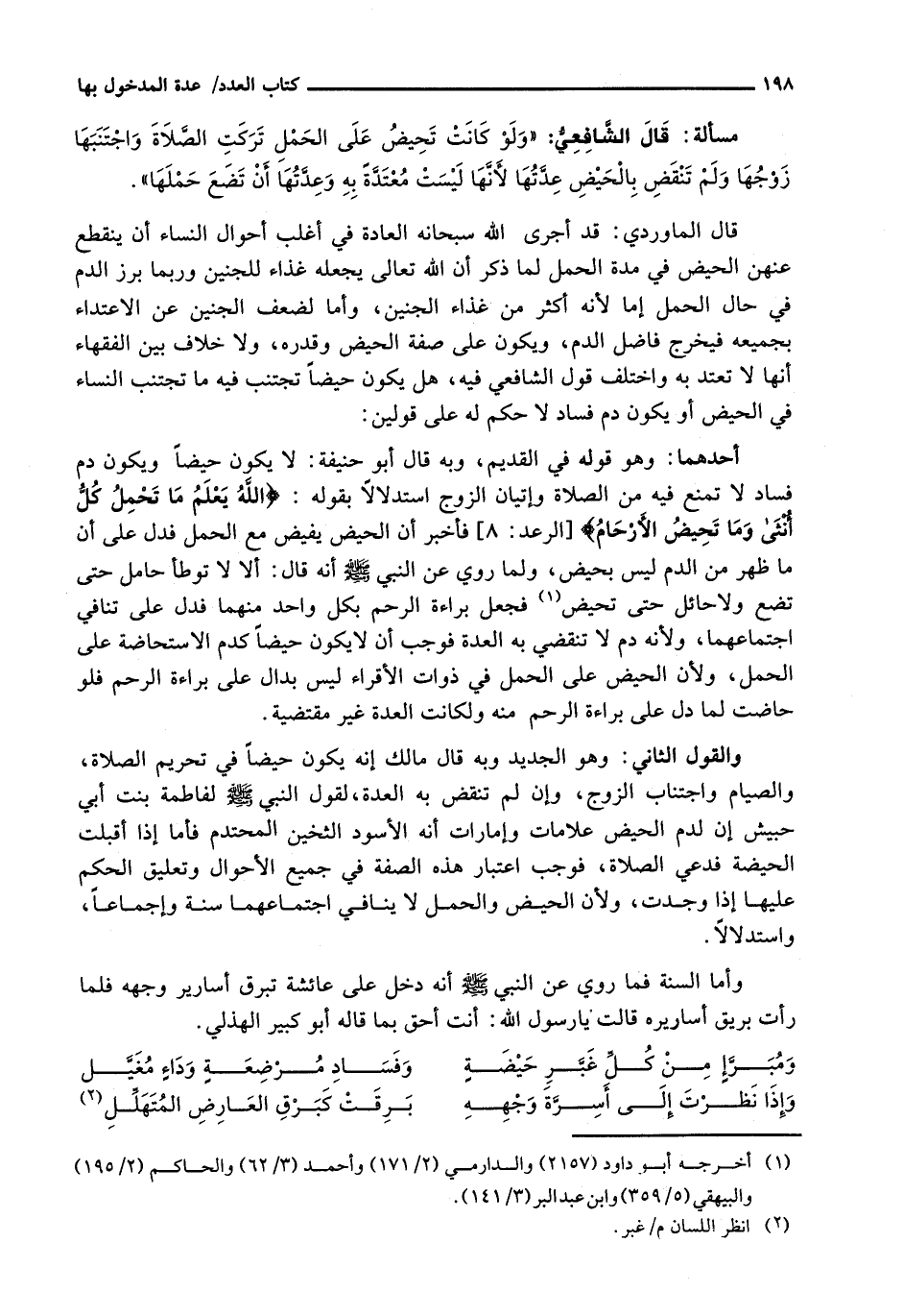 قَالَ الْمَاوَرْدِيُّ: قَدْ أَجْرَى اللَّهُ سُبْحَانَهُ الْعَادَةَ فِي أَغْلَبِ أَحْوَالِ النِّسَاءِ أَنْ يَنْقَطِعَ عَنْهُنَّ الْحَيْضُ فِي مُدَّةِ الْحَمْلِ لِمَا ذُكِرَ أَنَّ اللَّهَ تَعَالَى يَجْعَلُهُ غِذَاءً لِلْجَنِينِ وَرُبَّمَا بَرَزَ الدَّمُ فِي حَالِ الْحَمْلِ إِمَّا لِأَنَّهُ أَكْثَرُ مِنْ غِذَاءِ الْجَنِينِ، وَإِمَّا لِضَعْفِ الْجَنِينِ عَنِ الاعتداء بِجَمِيعِهِ فَيَخْرُجُ فَاضِلُ الدَّمِ، وَيَكُونُ عَلَى صِفَةِ الْحَيْضِ وَقَدْرِهِ، وَلَا خِلَافَ بَيْنَ الْفُقَهَاءِ أَنَّهَا لَا تَعْتَدُّ بِهِ وَاخْتَلَفَ قَوْلُ الشَّافِعِيِّ فِيهِ، هَلْ يَكُونُ حَيْضًا تَجْتَنِبُ فِيهِ مَا تَجْتَنِبُ النِّسَاءُ فِي الْحَيْضِ أَوْ يَكُونُ دَمَ فَسَادٍ لَا حُكْمَ لَهُ عَلَى قَوْلَيْنِ:
