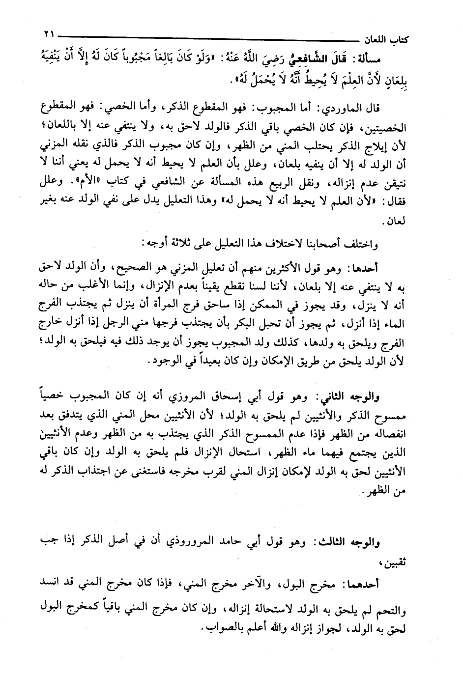 قَالَ الْمَاوَرْدِيُّ: أَمَّا الْمَجْبُوبُ: فَهُوَ الْمَقْطُوعُ الذَّكَرِ، وَأَمَّا الْخَصْيُّ: فَهُوَ الْمَقْطُوعُ الْخِصْيَتَيْنِ، فَإِنْ كَانَ الْخَصْيُ بَاقِيَ الذَّكَرِ فَالْوَلَدُ لَاحِقٌ بِهِ، وَلَا يَنْتَفِي عَنْهُ إِلَّا بِاللِّعَانِ؛ لِأَنَّ إِيلَاجَ الذَّكَرِ يَحْتَلِبُ الْمَنِيَّ مِنَ الظَّهْرِ، وَإِنْ كَانَ مَجْبُوبَ الذَّكَرِ فَالَّذِي نَقَلَهُ الْمُزَنِيُّ أَنَّ الْوَلَدَ لَهُ إِلَّا أَنْ يَنْفِيَهُ بِلِعَانٍ، وَعَلَّلَ بِأَنَّ الْعِلْمَ لَا يُحِيطُ أَنَّهُ لَا يُحْمَلُ لَهُ يَعْنِي أَنَّنَا لَا نَتَيَقَّنُ عَدَمَ إِنْزَالِهِ، وَنَقَلَ الرَّبِيعُ هَذِهِ الْمَسْأَلَةَ عَنِ الشَّافِعِيِّ فِي كِتَابِ " الْأُمِّ ". وَعَلَّلَ فَقَالَ: " لِأَنَّ الْعِلْمَ لَا يُحِيطُ أَنَّهُ لَا يُحْمَلُ لَهُ " وَهَذَا التَّعْلِيلُ يَدُلُّ عَلَى نَفْيِ الْوَلَدِ عَنْهُ بِغَيْرِ لِعَانٍ.
