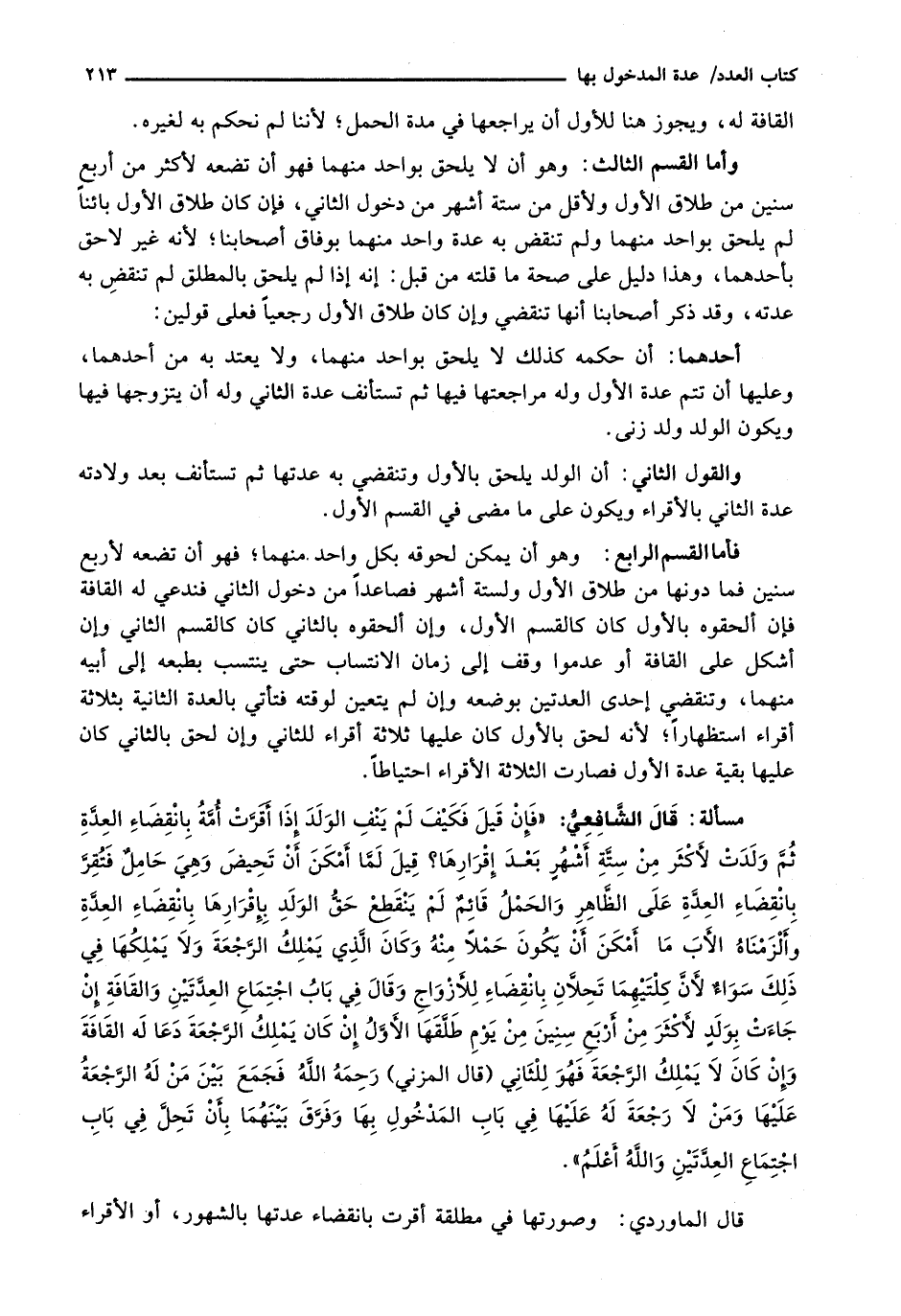 قال الشافعي: " فإن قيل فكيف لم ينف الْوَلَدُ إِذَا أَقَرَّتْ أُمُّهُ بِانْقِضَاءِ الْعِدَّةِ ثُمَّ وَلَدَتْ لِأَكْثَرَ مِنْ سِتَّةِ أَشْهُرٍ بَعْدَ إِقْرَارِهَا؟ قِيلَ لَمَّا أَمْكَنَ أَنْ تَحِيضَ وَهِيَ حَامِلٌ فَتُقِرَّ بِانْقِضَاءِ الْعِدَّةِ عَلَى الظَّاهِرِ وَالْحَمْلُ قَائِمٌ لَمْ يَنْقَطِعْ حَقُّ الْوَلَدِ بِإِقْرَارِهَا بِانْقِضَاءِ الْعِدَّةِ وَأَلْزَمْنَاهُ الْأَبَ مَا أَمْكَنَ أَنْ يَكُونَ حَمْلًا مِنْهُ وَكَانَ الَّذِي يَمْلِكُ الرَّجْعَةَ وَلَا يَمْلِكُهَا فِي ذَلِكَ سَوَاءٌ لِأَنَّ كِلْتَيْهِمَا تَحِلَّانِ بِانْقِضَاءٍ للأزواج وقال في باب اجتماع العدتين والقافة إن جاءت بولد لأكثر من أربع سنين من يوم طلقها الأول إن كان يملك الرجعة دعا له القافة وإن كان لا يملك الرجعة فهو للثاني (قال المزني) رحمه الله فجمع بين من له الرجعة عليها ومن لا رجعة له عليها في باب المدخول بها وفرق بينهما بأن تحل في باب اجتماع العدتين والله أعلم ".