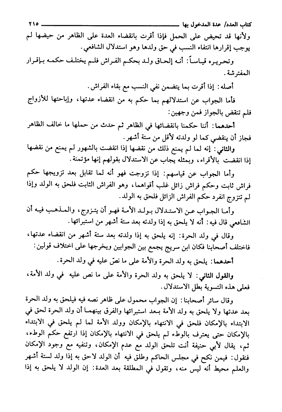 وَقَالَ سَائِرُ أَصْحَابِنَا: إِنَّ الْجَوَابَ مَحْمُولٌ عَلَى ظَاهِرِ نَصِّهِ فِيهِ فَيُلْحَقُ بِهِ وَلَدُ الْحُرَّةِ بَعْدَ عِدَّتِهَا وَلَا يُلْحَقُ به ولد الأمة بعد استبرائها والفراق بَيْنَهُمَا أَنَّ وَلَدَ الْحُرَّةِ لَحِقَ فِي الِابْتِدَاءِ بِالْإِمْكَانِ فَلَحِقَ فِي الِانْتِهَاءِ بِالْإِمْكَانِ وَوَلَدَ الْأَمَةِ لَمَّا لَمْ يُلْحَقْ فِي الِابْتِدَاءِ بِالْإِمْكَانِ حَتَّى يَعْتَرِفَ بِالْوَطْءِ لَمْ يُلْحَقْ فِي الِانْتِهَاءِ بِالْإِمْكَانِ إِذَا ارْتَفَعَ حُكْمُ الْوَطْءِ، ثُمَّ، يُقَالُ لِأَبِي حَنِيفَةَ أَنْتَ تُلْحِقُ الْوَلَدَ مَعَ عَدَمِ الْإِمْكَانِ، وَتَنْفِيهِ مَعَ وُجُودِ الْإِمْكَانِ فَنَقُولُ: فِيمَنْ نَكَحَ فِي مَجْلِسِ الْحَاكِمِ وَطَلَّقَ فِيهِ أَنَّ الْوَلَدَ لَاحِقٌ بِهِ إِذَا وُلِدَ لِسِتَّةِ أَشْهُرٍ وَالْعِلْمُ محيط أنه ليس منه، وتقول فِي الْمُطَلَّقَةِ بَعْدَ الْعِدَّةِ: إِنَّ الْوَلَدَ لَا يُلْحَقُ بِهِ إِذَا