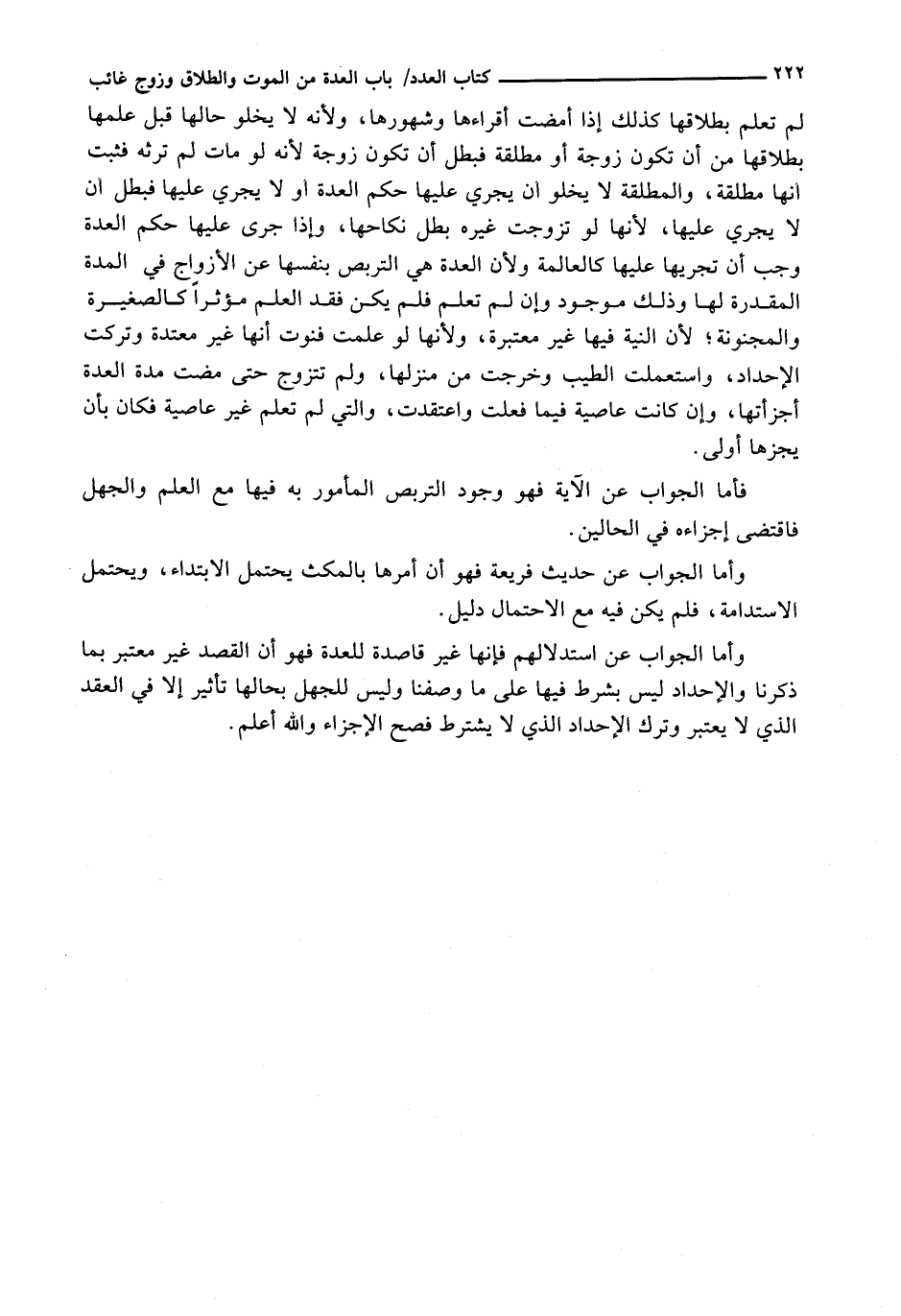 وَأَمَّا الْجَوَابُ عَنِ اسْتِدْلَالِهِمْ فَإِنَّهَا غير قاصد لِلْعِدَّةِ فَهُوَ أَنَّ الْقَصْدَ غَيْرُ مُعْتَبَرٍ بِمَا ذَكَرْنَا وَالْإِحْدَادَ لَيْسَ بِشَرْطٍ فِيهَا عَلَى مَا وَصَفْنَا وَلَيْسَ لِلْجَهْلِ بِحَالِهَا تَأْثِيرٌ إِلَّا فِي الْعَقْدِ الَّذِي لَا يُعْتَبَرُ وَتَرْكُ الْإِحْدَادِ الَّذِي لَا يُشْتَرَطُ فِصَحَّ الْإِجْزَاءُ وَاللَّهُ أَعْلَمُ.