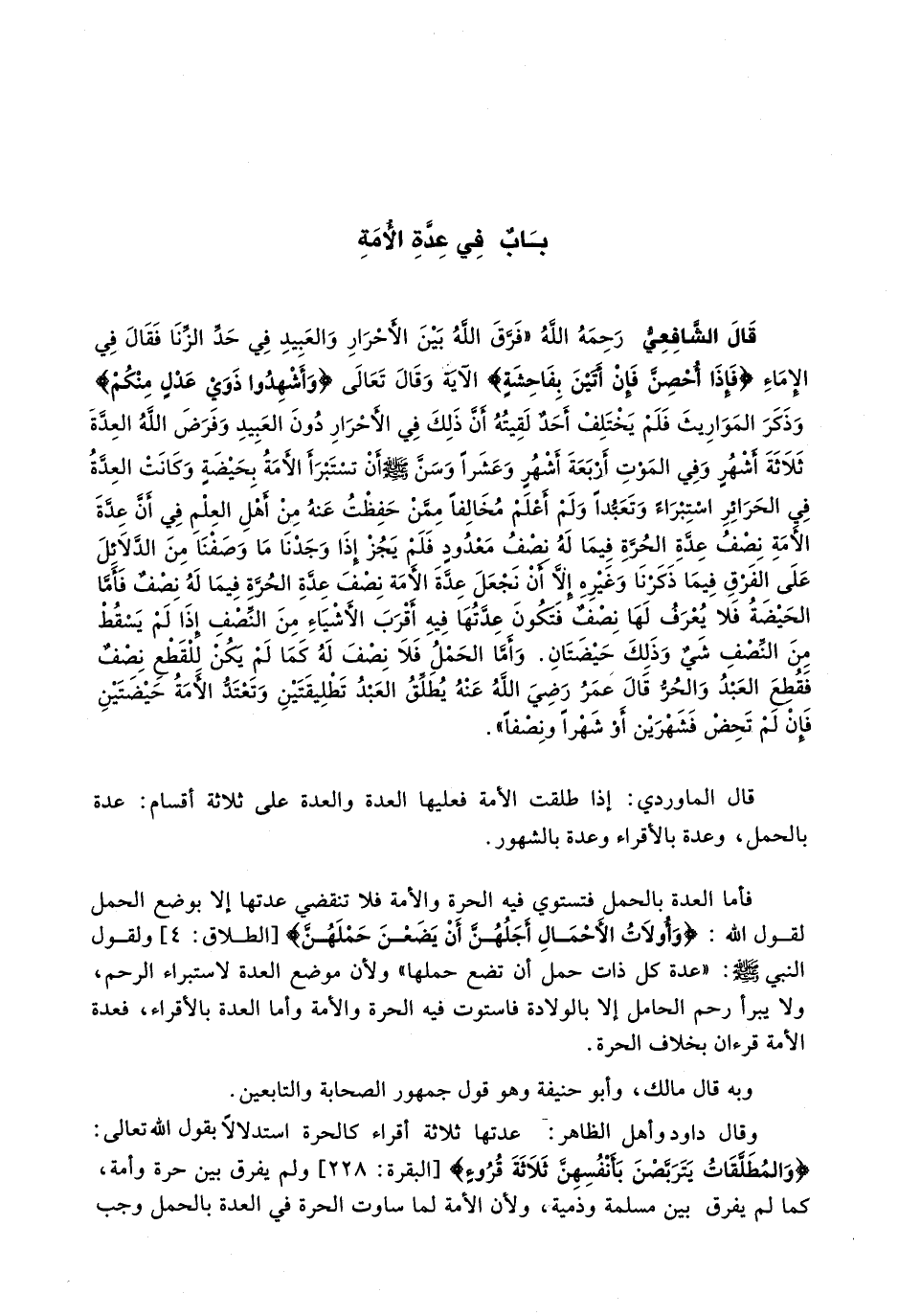 قَالَ الشَّافِعِيُّ رَحِمَهُ اللَّهُ " فَرَّقَ اللَّهُ بَيْنَ الْأَحْرَارِ وَالْعَبِيدِ فِي حَدِّ الزِّنَا فَقَالَ فِي الإماء {فإذا أحصن فإن أتين بفاحشة} الْآيَةَ وَقَالَ تَعَالَى {وَأَشْهِدُوا ذَوَيْ عَدْلٍ مِنْكُمْ} وَذَكَرَ الْمَوَارِيثَ فَلَمْ يَخْتَلِفْ أَحَدٌ لَقِيتُهُ أَنَّ ذَلِكَ فِي الْأَحْرَارِ دُونَ الْعَبِيدِ وَفَرَضَ اللَّهُ الْعِدَّةَ ثَلَاثَةَ أَشْهُرٍ وَفِي الْمَوْتِ أَرْبَعَةَ أَشْهُرٍ وعشراً وسن - صَلَّى اللَّهُ عَلَيْهِ وَسَلَّم َ - أَنْ تُسْتَبْرَأَ الْأَمَةُ بِحَيْضَةٍ وَكَانَتِ الْعِدَّةُ فِي الْحَرَائِرِ اسْتِبْرَاءً وَتَعَبُّدًا وَلَمْ أَعْلَمْ مُخَالِفًا مِمَّنْ حَفِظْتُ عَنْهُ مِنْ أَهْلِ الْعِلْمِ فِي أَنَّ عدة الأمة نصف عدة الحرة فيما له نِصْفٌ مَعْدُودٌ فَلَمْ يَجُزْ إِذَا وَجَدْنَا مَا وَصَفْنَا مِنَ الدَّلَائِلَ عَلَى الْفَرْقِ فِيمَا ذَكَرْنَا وَغَيْرِهِ إِلَّا أَنْ نَجْعَلَ عِدَّةَ الْأَمَةِ نِصْفَ عِدَّةِ الْحُرَّةِ فِيمَا لَهُ نِصْفٌ فَأَمَّا الْحَيْضَةُ فَلَا يُعْرَفُ لَهَا نِصْفٌ فَتَكُونَ عِدَّتُهَا فِيهِ أَقْرَبَ الْأَشْيَاءِ مِنَ النِّصْفِ إِذَا لَمْ يَسْقُطْ مِنَ النِّصْفِ شَيْءٌ وَذَلِكَ حَيْضَتَانِ. وَأَمَّا الْحَمْلُ فَلَا نِصْفَ لَهُ كَمَا لَمْ يَكُنْ لِلْقَطْعِ نِصْفٌ فَقُطِعَ الْعَبْدُ وَالْحُرُّ قَالَ عُمَرُ رَضِيَ اللَّهُ عَنْهُ يُطَلِّقُ الْعَبْدُ تَطْلِيقَتَيْنِ وَتَعْتَدُّ الْأَمَةُ حَيْضَتَيْنِ فَإِنْ لَمْ تَحِضْ فَشَهْرَيْنِ أَوْ شَهْرًا وَنِصْفًا ".