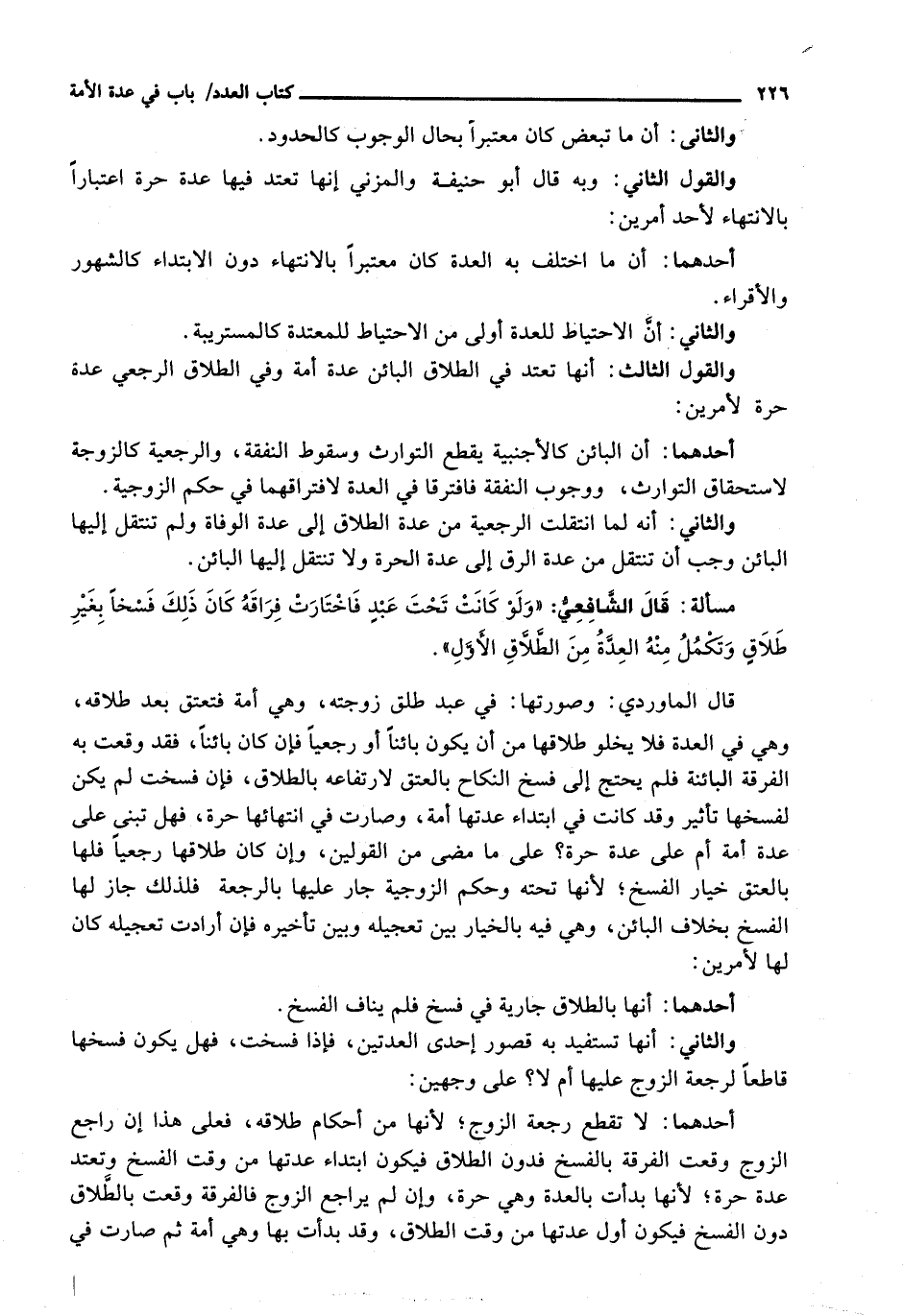 قَالَ الْمَاوَرْدِيُّ: وَصُورَتُهَا: فِي عَبْدٍ طَلَّقَ زَوْجَتَهُ، وَهِيَ أَمَةٌ فَتُعْتَقُ بَعْدَ طَلَاقِهِ، وَهِيَ فِي الْعِدَّةِ فَلَا يَخْلُو طَلَاقُهَا مِنْ أَنْ يَكُونَ بَائِنًا أَوْ رَجْعِيًّا فَإِنْ كَانَ بَائِنًا، فَقَدْ وَقَعَتْ بِهِ الْفُرْقَةُ الْبَائِنَةُ فَلَمْ يَحْتَجْ إِلَى فَسْخِ النِّكَاحِ بِالْعِتْقِ لِارْتِفَاعِهِ بِالطَّلَاقِ، فَإِنْ فَسَخَتْ لَمْ يَكُنْ لِفَسْخِهَا تَأْثِيرٌ وَقَدْ كَانَتْ فِي ابْتِدَاءِ عِدَّتِهَا أَمَةً، وَصَارَتْ فِي انْتِهَائِهَا حُرَّةً، فَهَلْ تُبْنَى عَلَى عِدَّةِ أَمَةٍ أَمْ عَلَى عِدَّةِ حُرَّةٍ؟ عَلَى مَا مَضَى مِنَ الْقَوْلَيْنِ، وَإِنْ كَانَ طَلَاقُهَا رَجْعِيًّا فَلَهَا بِالْعِتْقِ خِيَارُ الْفَسْخِ؛ لِأَنَّهَا تَحْتَهُ وَحُكْمُ الزَّوْجِيَّةِ جَارٍ عَلَيْهَا بِالرَّجْعَةِ فَلِذَلِكَ جَازَ لَهَا الْفَسْخُ بِخِلَافِ الْبَائِنِ، وَهِيَ فِيهِ بِالْخِيَارِ بَيْنَ تَعْجِيلِهِ وَبَيْنَ تَأْخِيرِهِ فَإِنْ أَرَادَتْ تَعْجِيلَهُ كَانَ لَهَا لِأَمْرَيْنِ: