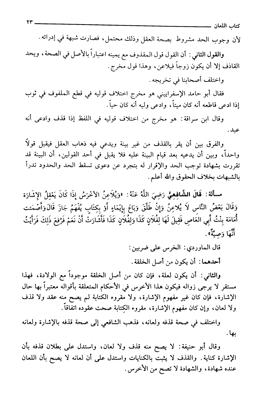 وَالثَّانِي: أَنْ يَكُونَ لِعِلَّةٍ، فَإِنْ كَانَ مَنْ أَصْلِ الْخِلْقَةِ مَوْجُودًا مَعَ الْوِلَادَةِ، فَهَذَا مُسْتَقِرٌّ لَا يُرْجَى زَوَالُهُ فَيَكُونُ هَذَا الْأَخْرَسُ فِي الْأَحْكَامِ الْمُتَعَلِّقَةِ بأقواله معتبرا بها حال الإشارة، فَإِنْ كَانَ غَيْرَ مَفْهُومِ الْإِشَارَةِ، وَلَا مَقْرُوءِ الْكِتَابَةِ لَمْ يَصِحَّ مِنْهُ عَقْدٌ وَلَا قَذْفٌ وَلَا لِعَانٌ، وَإِنْ كَانَ مَفْهُومَ الْإِشَارَةِ، مَقْرُوءَ الْكِتَابَةِ صَحَّتْ عُقُودُهُ اتِّفَاقًا.