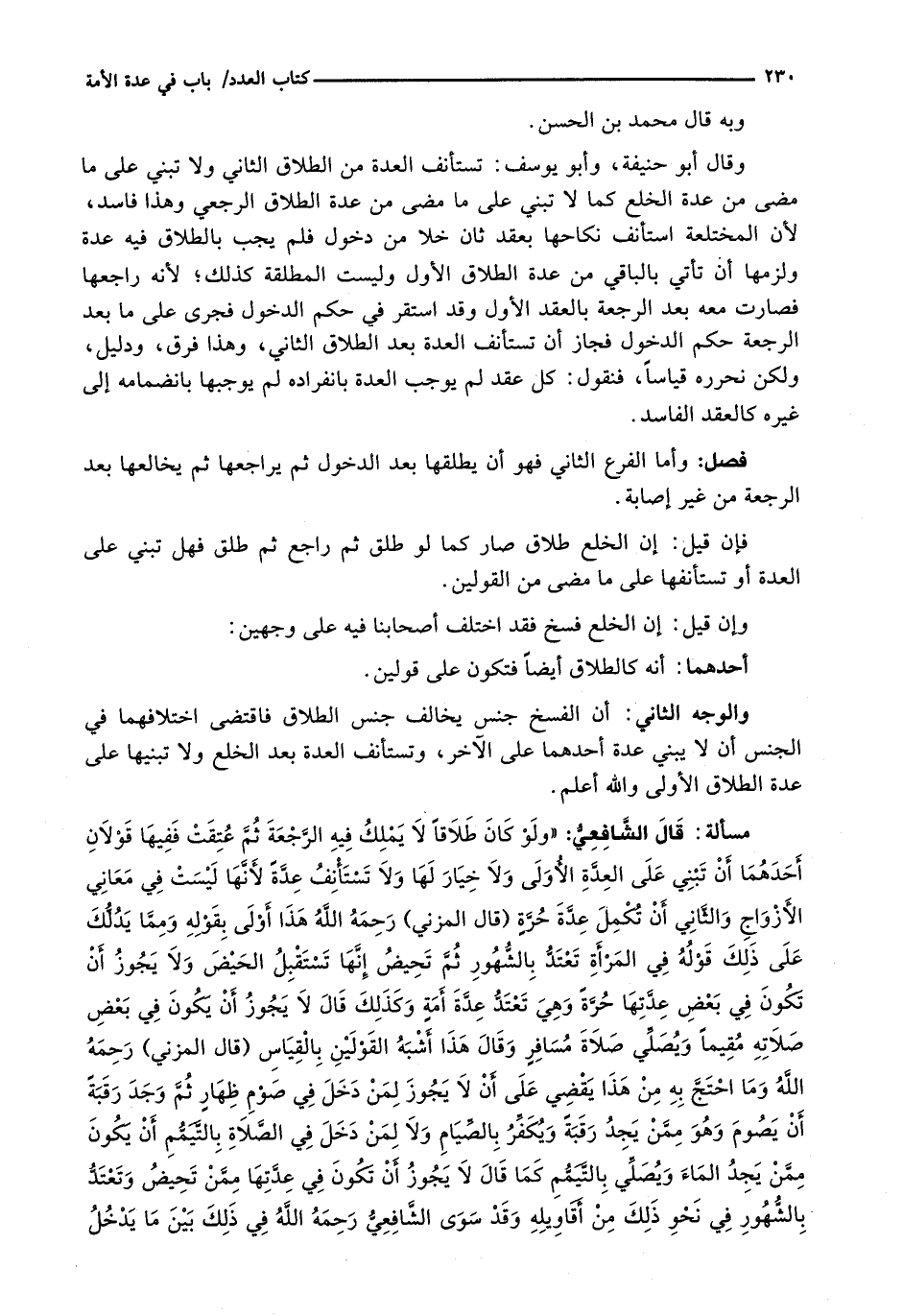 قال الشافعي: " وَلَوْ كَانَ طَلَاقًا لَا يَمْلِكُ فِيهِ الرَّجْعَةَ ثَمَّ عُتِقَتْ فَفِيهَا قَوْلَانِ أَحَدُهُمَا أَنْ تَبْنِيَ عَلَى الْعِدَّةِ الْأُولَى وَلَا خِيَارَ لَهَا وَلَا تَسْتَأْنِفُ عِدَةً لِأَنَّهَا لَيْسَتْ فِي مَعَانِي الْأَزْوَاجِ والثاني: أن تكمل عدة حرة (قَالَ الْمُزَنِيُّ) رَحِمَهُ اللَّهُ هَذَا أَوْلَى بِقَوْلِهِ ومما يدلك على ذلك قوله في المرأة تعتد بالشهور ثم تحيض إنها تستقبل الحيض ولا يجوز أن تكون في بعض عدتها حرة وهي تعتد عدة أمة وكذلك قال لا يجوز أن يكون في بعض صلاته مقيما ويصلي صلاة مسافر وقال هذا أشبه القولين بالقياس (قال المزني) رحمه الله وما احتج به من هذا يقضي على أن لا يجوز لمن دخل في صوم ظهار ثم وجد رقبة أن يصوم وهو ممن يجد رقبة ويكفر بالصيام ولا لمن دخل في الصلاة بالتيمم أن يكون ممن يجد الماء ويصلي بالتيمم كما قال لا يجوز أن تكون في عدتها ممن تحيض وتعتد بالشهور في نحو ذلك من أقاويله وقد سوى الشافعي رحمه الله في ذلك بين ما يدخل