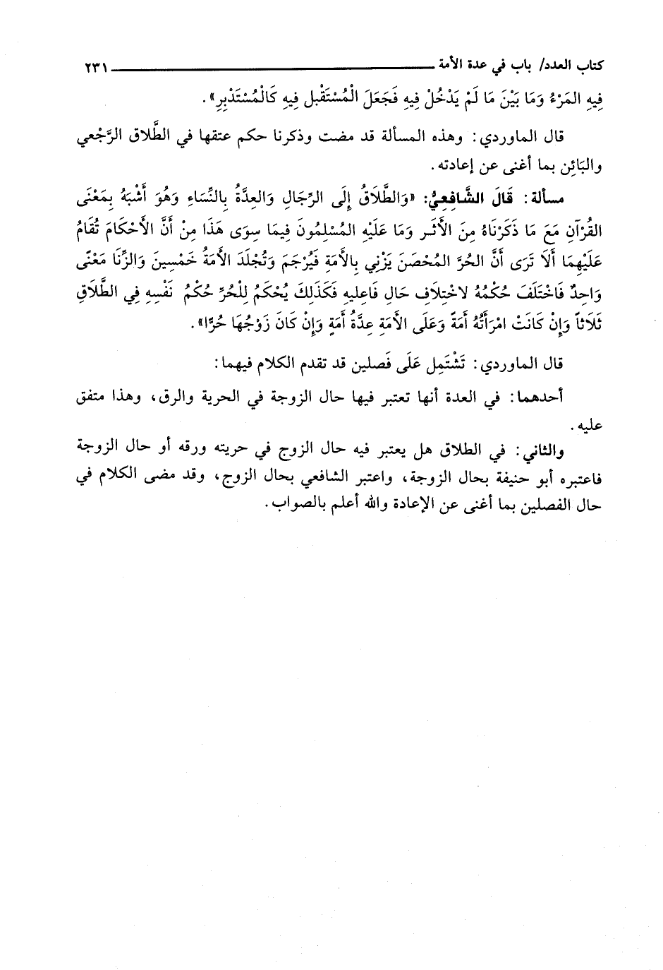 أَحَدُهُمَا: فِي الْعِدَّةِ أَنَّهَا تُعْتَبَرُ فيه حَالُ الزَّوْجَةِ فِي الْحُرِّيَّةِ وَالرِّقِّ، وَهَذَا مُتَّفَقٌ عَلَيْهِ. وَالثَّانِي: فِي الطَّلَاقِ هَلْ يُعْتَبَرُ فِيهِ حال الزَّوْجِ فِي حُرِّيَّتِهِ وَرِقِّهِ أَوْ حَالُ الزَّوْجَةِ فاعتبره أبو حنيفة بحال الزوجة، واعتبر الشَّافِعِيُّ بِحَالِ الزَّوْجِ، وَقَدْ مَضَى الْكَلَامُ فِي حَالِ الْفَصْلَيْنِ بِمَا أَغْنَى عَنِ الْإِعَادَةِ وَاللَّهُ أَعْلَمُ بِالصَّوَابِ.