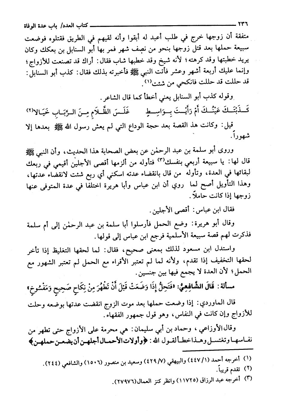 مُتَّفِقَةٍ أَنَّ زَوْجَهَا خَرَجَ فِي طَلَبِ أَعْبُدٍ لَهُ أَبَقُوا وَأَنَّهُ لَقِيَهُمْ فِي الطَّرِيقِ فَقَتَلُوهُ فَوَضَعَتْ سُبَيْعَةُ حَمْلَهَا بَعْدَ قَتْلِ زَوْجِهَا بِنَحْوٍ مِنْ نِصْفِ شَهْرٍ فَمَرَّ بِهَا أَبُو السَّنَابِلِ بْنُ بَعْكَكٍ وَكَانَ يُرِيدُ خِطْبَتَهَا وَقَدْ كَرِهَتْهُ؛ لِأَنَّهُ شَيْخٌ وَقَدْ خَطَبَهَا شَابٌّ فَقَالَ: أَرَاكِ قَدْ تَصَنَّعْتِ لِلْأَزْوَاجِ؛ وَإِنَّمَا عَلَيْكِ أَرْبَعَةُ أَشْهُرٍ وَعَشْرٌ فَأَتَتِ النَّبِيَّ - صَلَّى اللَّهُ عَلَيْهِ وَسَلَّم َ - فأخبرته بذلك فقال: كذب أو السَّنَابِلِ: قَدْ حَلَلْتِ قَدْ حَلَلْتِ فَانْكِحِي مَنْ شِئْتِ.