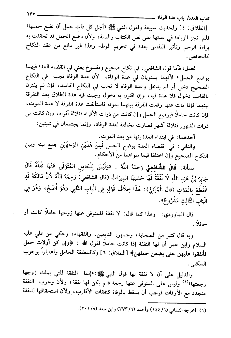 قال الشافعي رَحِمَهُ اللَّهُ: " وَلَيْسَ لِلْحَامِلِ الْمُتَوَفَّى عَنْهَا نَفَقَةٌ قَالَ جَابِرُ بْنُ عَبْدِ اللَّهِ لَا نَفَقَةَ لَهَا حَسْبُهَا الْمِيرَاثُ (قَالَ الشَّافِعِيُّ) رَحِمَهُ اللَّهُ لأن مالكه قد انقطع بالموت (قال الْمُزَنِيِّ) : هَذَا خِلَافُ قَوْلِهِ فِي الْبَابِ الثَّانِي وهو أصح، وهو في الباب الثالث مشروح ".