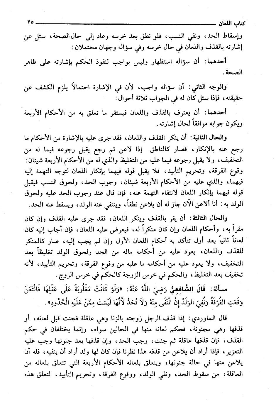 قَالَ الماوردي: إِذَا قَذَفَ الرَّجُلُ زَوْجَتَهُ بِالزِّنَا وَهِيَ عَاقِلَةٌ فَجُنَّتْ قَبْلَ لِعَانِهِ، أَوْ قَذَفَهَا وَهِيَ مَجْنُونَةٌ، فَحُكْمُ لِعَانِهِ مِنْهَا فِي الْحَالَيْنِ سَوَاءٌ، وَإِنَّمَا يَخْتَلِفَانِ فِي حُكْمِ الْقَذْفِ، فَإِنْ قَذَفَهَا عَاقِلَةً ثُمَّ جُنَّتْ، وَجَبَ الْحَدُّ، وَإِنْ قَذَفَهَا بَعْدَ جُنُونِهَا وَجَبَ عَلَيْهِ التَّعْزِيرُ، فَإِذَا أَرَادَ أَنْ يُلَاعِنَ مِنْ قَذْفِهِ هَذَا نَظَرْنَا فَإِنْ كَانَ لَهَا وَلَدٌ أَرَادَ أَنْ يَنْفِيَهُ، فَلَهُ أَنْ يُلَاعِنَ مِنْهَا فِي حَالَةِ جُنُونِهَا، وَيَتَعَلَّقُ بِلِعَانِهِ الْأَحْكَامُ الْأَرْبَعَةُ الَّتِي تَتَعَلَّقُ بِلِعَانِهِ مِنَ الْعَاقِلَةِ، مِنْ سُقُوطِ الْحَدِّ، وَنَفْيِ الْوَلَدِ، وَوُقُوعِ الْفُرْقَةِ، وَتَحْرِيمِ التَّأْبِيدِ، لِتَعَلُّقِ هَذِهِ