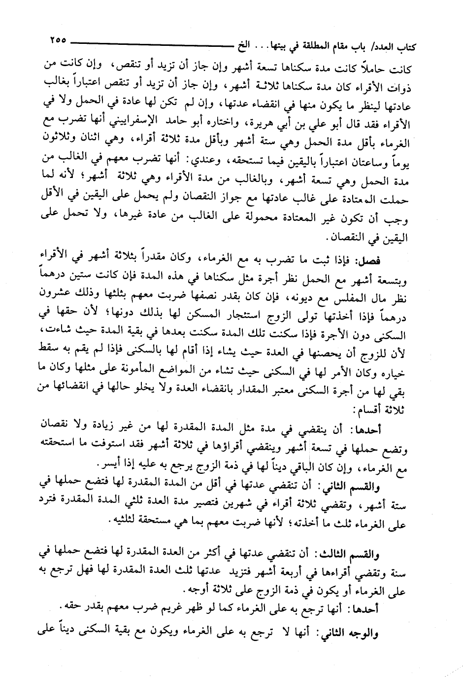 وَالْقِسْمُ الثَّالِثُ: أَنْ تَنْقَضِيَ عِدَّتُهَا فِي أَكْثَرَ مِنَ الْعِدَّةِ الْمُقَدَّرَةِ لَهَا فَتَضَعَ حَمْلَهَا فِي سَنَةٍ وَتَقْضِيَ أَقَرَاءَهَا فِي أَرْبَعَةِ أَشْهُرٍ فَتَزِيدَ عِدَّتُهَا ثُلُثَ الْعِدَّةِ الْمُقَدَّرَةِ لَهَا فَهَلْ تَرْجِعُ بِهِ عَلَى الْغُرَمَاءِ أَوْ يَكُونُ فِي ذِمَّةِ الزَّوْجِ عَلَى ثَلَاثَةِ أَوْجُهٍ.