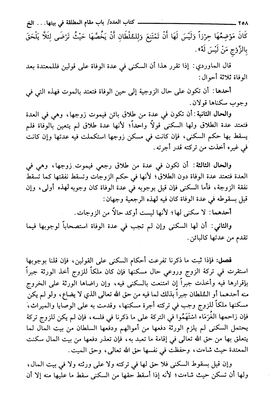 قَالَ الْمَاوَرْدِيُّ: إِذَا تَقَرَّرَ هَذَا أَنَّ السُّكْنَى فِي عِدَّةِ الْوَفَاةِ عَلَى قَوْلَيْنِ فَلِلْمُعْتَدَّةِ بَعْدَ الْوَفَاةِ ثَلَاثَةُ أَحْوَالٍ: