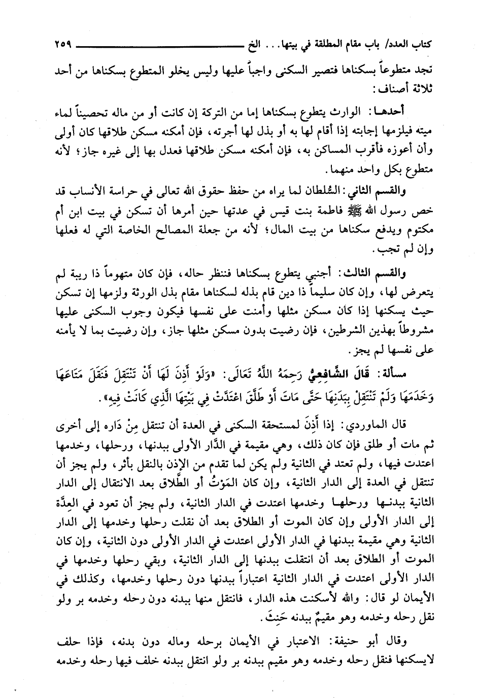 قَالَ الْمَاوَرْدِيُّ: إِذَا أُذِنَ لِمُسْتَحَقَّةِ السُّكْنَى فِي الْعِدَّةِ أَنْ تَنْتَقِلَ مِنْ دَارِهِ إِلَى أُخْرَى ثُمَّ مَاتَ أَوْ طَلَّقَ فَإِنْ كَانَ ذَلِكَ، وَهِيَ مُقِيمَةٌ فِي الدَّارِ الْأُولَى بِبَدَنِهَا، وَرَحْلِهَا، وَخَدَمِهَا اعْتَدَّتْ فِيهَا، وَلَمْ تَعْتَدَّ فِي الثَّانِيَةِ وَلَمْ يَكُنْ لِمَا تَقَدَّمَ مِنَ الْإِذْنِ بِالنَّقْلِ بِأَثَرٍ، وَلَمْ يَجُزْ أَنْ تَنْتَقِلَ فِي الْعِدَّةِ إِلَى الدَّارِ الثَّانِيَةِ، وَإِنْ كَانَ الْمَوْتُ أَوِ الطَّلَاقُ بَعْدَ الِانْتِقَالِ إِلَى الدَّارِ الثَّانِيَةِ بِبَدَنِهَا وَرَحْلِهَا وَخَدَمِهَا اعْتَدَتْ فِي الدَّارِ الثَّانِيَةِ، وَلَمْ يَجُزْ أَنْ تَعُودَ فِي الْعِدَّةِ إِلَى الدَّارِ الْأُولَى وَإِنْ كَانَ الْمَوْتُ أَوِ الطَّلَاقُ بَعْدَ أَنْ نَقَلَتْ رَحْلَهَا وَخَدَمَهَا إِلَى الدَّارِ الثَّانِيَةِ وَهِيَ مُقِيمَةٌ بِبَدَنِهَا فِي الدَّارِ الْأُولَى اعْتَدَّتْ فِي الدَّارِ الْأُولَى دُونَ الثَّانِيَةِ، وَإِنْ كَانَ الْمَوْتُ أَوِ الطَّلَاقُ بَعْدَ أَنِ انْتَقَلَتْ بِبَدَنِهَا إِلَى الدَّارِ الثَّانِيَةِ، وَبَقِيَ رَحْلُهَا وَخَدَمُهَا فِي الدَّارِ الْأُولَى اعْتَدَّتْ فِي الدَّارِ الثَّانِيَةِ اعْتِبَارًا بِبَدَنِهَا دُونَ رَحْلِهَا وَخَدَمِهَا، وَكَذَلِكَ فِي الْأَيْمَانِ لو قال: والله لأسكنت هَذِهِ الدَّارَ، فَانْتَقَلَ مِنْهَا بِبَدَنِهِ دُونَ رَحْلِهِ وَخَدَمِهِ بَرَّ وَلَوْ نَقَلَ رَحْلَهُ وَخَدَمَهُ وَهُوَ مُقِيمٌ بِبَدَنِهِ حَنِثَ.
