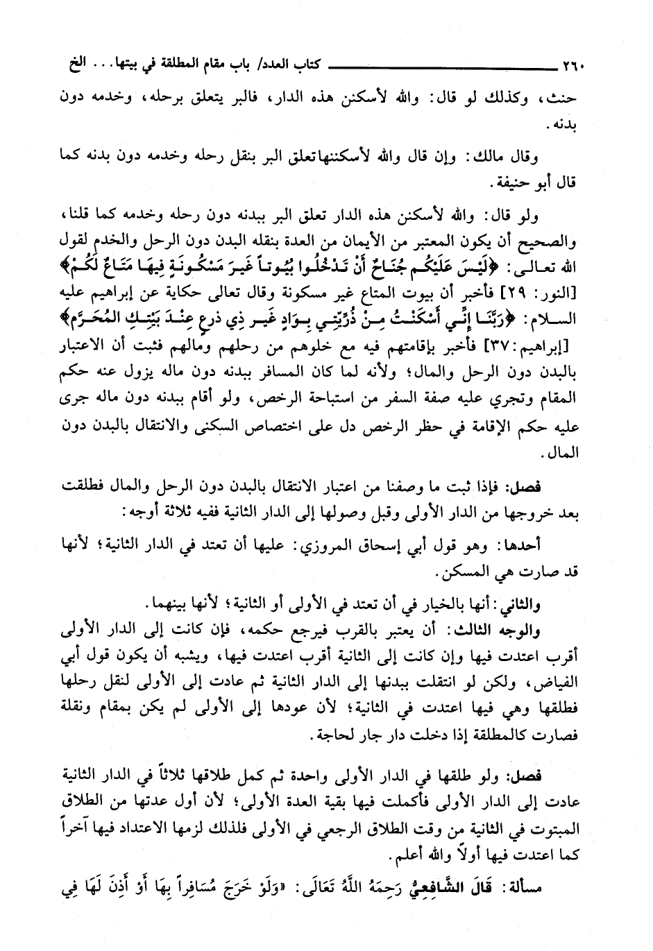 فَإِذَا ثَبَتَ مَا وَصَفْنَا مِنِ اعْتِبَارِ الِانْتِقَالِ بِالْبَدَنِ دُونَ الرَّحْلِ وَالْمَالِ فَطُلِّقَتْ بَعْدَ خُرُوجِهَا مِنَ الدَّارِ الْأُولَى وَقَبْلَ وُصُولِهَا إِلَى الدَّارِ الثَّانِيَةِ فَفِيهِ ثَلَاثَةُ أَوْجُهٍ: