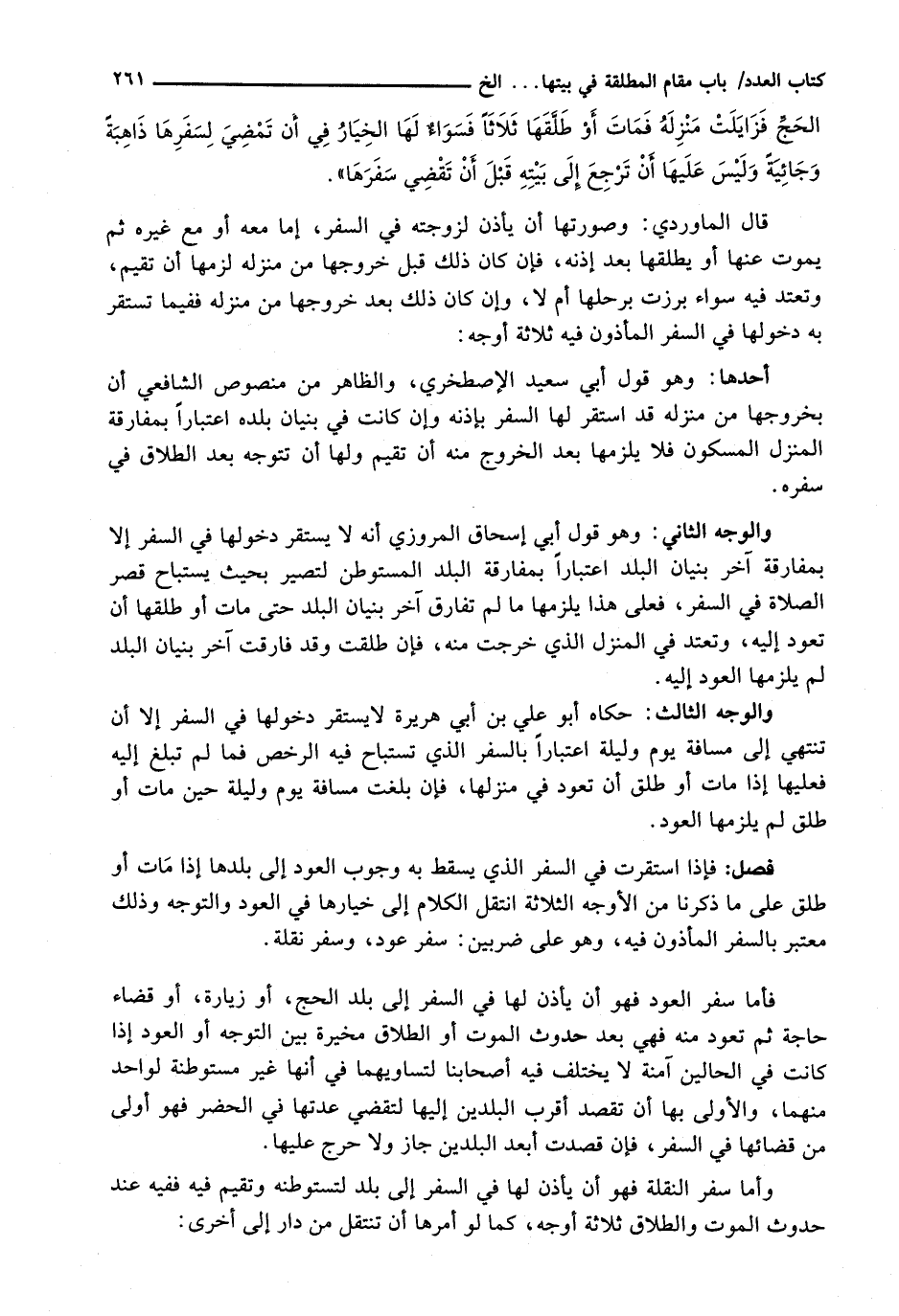 وَالْوَجْهُ الثَّالِثُ: حَكَاهُ أَبُو عَلِيِّ بْنُ أَبِي هُرَيْرَةَ لَا يَسْتَقِرُّ دُخُولُهَا فِي السَّفَرِ إِلَّا أَنْ تَنْتَهِيَ إِلَى مَسَافَةِ يَوْمٍ وَلَيْلَةٍ اعْتِبَارًا بِالسَّفَرِ الَّذِي تُسْتَبَاحُ فِيهِ الرُّخَصُ فَمَا لَمْ تَبْلُغْ إِلَيْهِ فَعَلَيْهَا إِذَا مَاتَ أَوْ طَلَّقَ أَنْ تَعُودَ فِي مَنْزِلِهَا، فَإِنْ بَلَغَتْ مَسَافَةَ يَوْمٍ وَلَيْلَةٍ حِينَ مَاتَ أَوْ طَلَّقَ لَمْ يَلْزَمْهَا الْعَوْدُ.