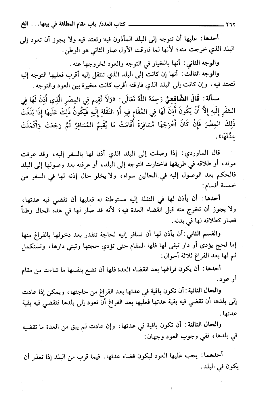 قال الشافعي رحمه الله تعالى: " وَلَا تُقِيمُ فِي الْمِصْرِ الَّذِي أَذِنَ لَهَا فِي السَّفَرِ إِلَيْهِ إِلَّا أَنْ يَكُونَ أَذِنَ لَهَا فِي الْمُقَامِ فِيهِ أَوِ النُّقْلَةِ إِلَيْهِ فَيَكُونُ ذَلِكَ عَلَيْهَا إِذَا بَلَغَتْ ذَلِكَ الْمِصْرَ فَإِنْ كَانَ أَخْرَجَهَا مُسَافِرَةً أَقَامَتْ مَا يُقِيمُ الْمُسَافِرُ ثَمَّ رَجَعَتْ وَأَكْمَلَتْ عِدَّتَهَا ".