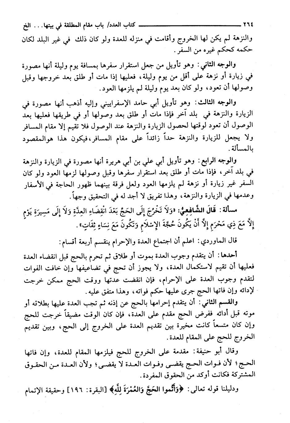 وَالْوَجْهُ الرَّابِعُ: وَهُوَ تَأْوِيلُ أَبِي عَلِيِّ بْنِ أَبِي هُرَيْرَةَ أَنَّهَا مُصَوَّرَةٌ فِي الزِّيَارَةِ وَالنُّزْهَةِ فِي بَلَدٍ آخَرَ، فَإِذَا مَاتَ أَوْ طَلَّقَ بَعْدَ اسْتِقْرَارِ سَفَرِهَا وَقَبْلَ وُصُولِهَا لَزِمَهَا الْعَوْدُ وَلَوْ كان وَعَدَمُهَا فِي الزِّيَارَةِ وَالنُّزْهَةِ، وَهَذَا تَفْرِيقٌ لَا أَجِدُ لَهُ فِي التَّحْقِيقِ وَجْهًا.