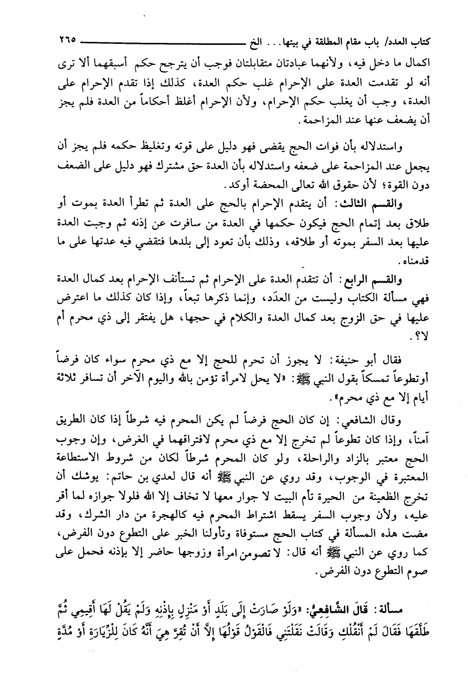 وَالْقِسْمُ الرَّابِعُ: أَنْ تَتَقَدَّمَ الْعِدَّةُ عَلَى الْإِحْرَامِ ثُمَّ تَسْتَأْنِفَ الْإِحْرَامَ بَعْدَ كَمَالِ الْعِدَّةِ فَهِيَ مَسْأَلَةُ الْكِتَابِ وَلَيْسَتْ مِنَ الْعِدَدِ، وَإِنَّمَا ذَكَرَهَا تَبَعًا، وَإِذَا كَانَ كَذَلِكَ مَا اعْتَرَضَ عَلَيْهَا فِي حَقِّ الزَّوْجِ بَعْدَ كَمَالِ الْعِدَّةِ وَالْكَلَامُ فِي حَجِّهَا، هَلْ يَفْتَقِرُ إِلَى ذِي مَحْرَمٍ أَمْ لَا؟ .