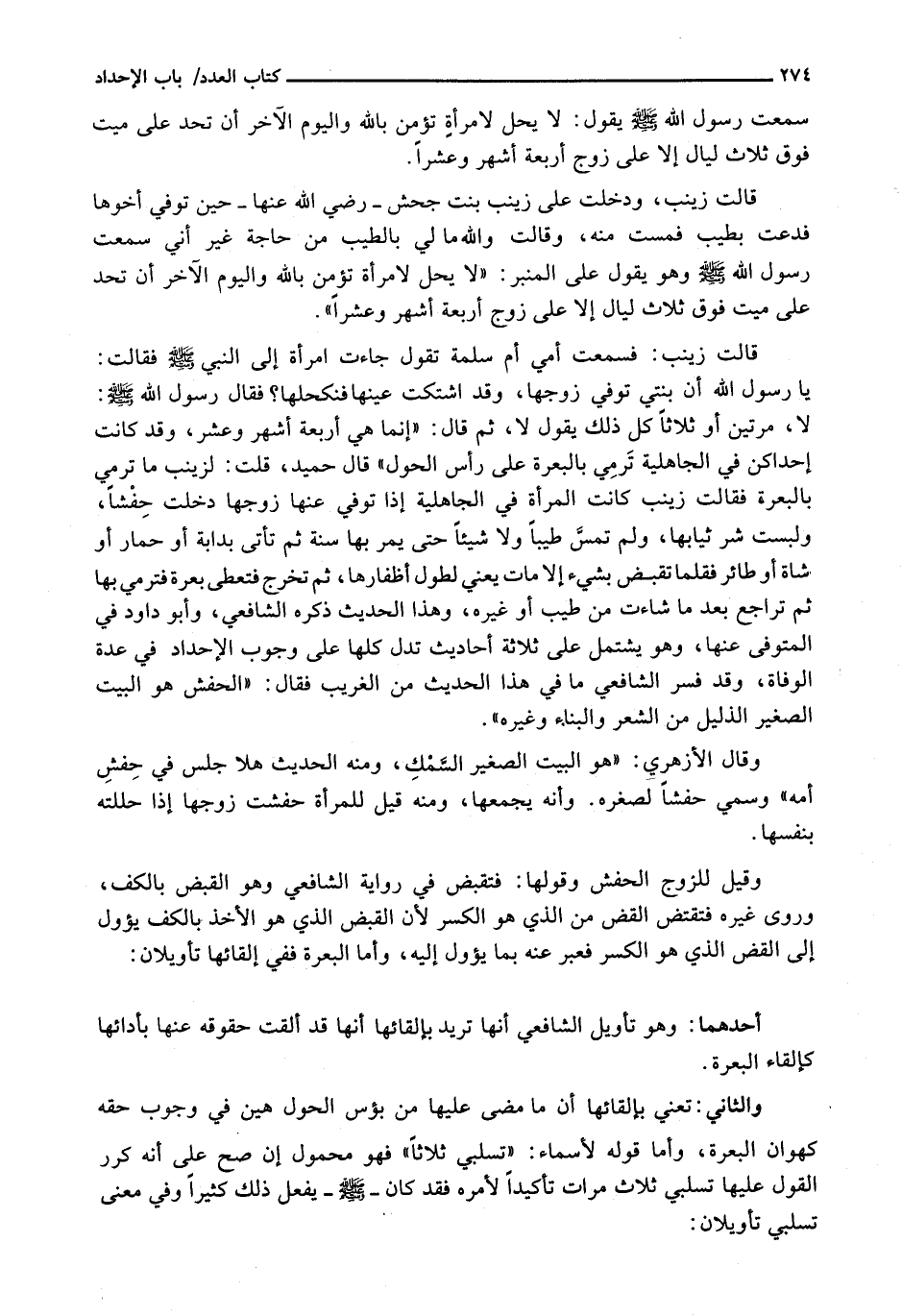 قَالَتْ زَيْنَبُ: فَسَمِعْتُ أُمِّي أُمَّ سَلَمَةَ تَقُولُ جَاءَتِ امْرَأَةٌ إِلَى النَّبِيِّ - صَلَّى اللَّهُ عَلَيْهِ وَسَلَّم َ - فقالت يا رسول الله إن بنتي توفي زَوْجُهَا، وَقَدِ اشْتَكَتْ عَيْنَهَا فَنَكْحُلُهَا؟ فَقَالَ رَسُولُ اللَّهِ - صَلَّى اللَّهُ عَلَيْهِ وَسَلَّم َ - لَا، مَرَّتَيْنِ أَوْ ثَلَاثًا كُلُّ ذَلِكَ يَقُولُ لَا، ثُمَّ قَالَ: " إِنَّمَا هِيَ أَرْبَعَةُ أَشْهُرِ وَعَشْرٌ، وَقَدْ كَانَتْ إِحْدَاكُنَّ فِي الْجَاهِلِيَّةِ تَرْمِي بِالْبَعْرَةِ عَلَى رَأْسِ الْحَوْلِ " قَالَ حُمَيْدٌ، قُلْتُ: لِزَيْنَبَ مَا تَرْمِي بِالْبَعْرَةِ فَقَالَتْ زَيْنَبُ كَانْتِ الْمَرْأَةُ فِي الْجَاهِلِيَّةِ إِذَا تُوُفِّيَ عَنْهَا زَوْجُهَا دَخَلَتْ حِفْشًا، وَلَبِسَتْ شَرَّ ثِيَابِهَا، وَلَمْ تَمَسَّ طِيبًا وَلَا شَيْئًا حَتَّى يَمُرَّ بِهَا سَنَةٌ ثُمَّ تَأْتِي بِدَابَّةٍ أَوْ حِمَارٍ أَوْ شَاةٍ أَوْ طَائِرٍ فَقَلَّمَا تَقْبِضُ بِشَيْءٍ إِلَّا مَاتَ يَعْنِي لِطُولِ أَظْفَارِهَا، ثُمَّ تَخْرُجُ فَتُعْطَى بَعْرَةً فَتَرْمِي بِهَا ثُمَّ تُرَاجِعُ بَعْدُ مَا شَاءَتْ مِنْ طِيبٍ أَوْ غَيْرِهِ، وَهَذَا الْحَدِيثُ ذَكَرَهُ الشَّافِعِيُّ، وَأَبُو دَاوُدَ فِي الْمُتَوَفَّى عَنْهَا، وَهُوَ يَشْتَمِلُ عَلَى ثَلَاثَةِ أَحَادِيثَ تَدُلُّ كُلُّهَا عَلَى وُجُوبِ الْإِحْدَادِ فِي عِدَّةِ الْوَفَاةِ، وَقَدْ فَسَّرَ الشَّافِعِيُّ مَا فِي هَذَا الْحَدِيثِ مِنَ الْغَرِيبِ فَقَالَ: " الْحِفْشُ هُوَ الْبَيْتُ الصَّغِيرُ الذَّلِيلُ مِنَ الشعر والبناء وغيره ".