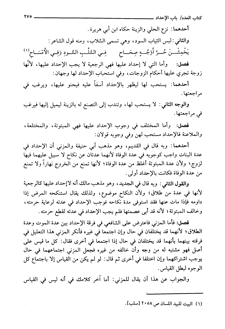 وَالْقَوْلُ الثَّانِي: وَبِهِ قَالَ فِي الْجَدِيدِ، وَهُوَ مَذْهَبُ مَالِكٍ أَنَّهُ لَا إِحْدَادَ عَلَيْهَا كَالرَّجْعِيَّةِ لِأَنَّهَا فِي عِدَّةٍ مِنْ طَلَاقٍ؛ وَلِأَنَّ النِّكَاحَ مَوْضُوعٌ، وَلِذَلِكَ يُقَالُ اسْتَنْكَحَهُ المرض إذا دوامه فَإِذَا مَاتَ عَنْهَا فَقَدِ اسْتَوْفَى مُدَّةَ نِكَاحِهِ فَوَجَبَ الْإِحْدَادُ فِي عِدَّتِهِ لِرِعَايَةِ حُرْمَتِهِ، وَخَالَفَ الْمَبْتُوتَةَ؛ لِأَنَّهُ قَدْ أَبَى عِصْمَتَهَا فَلَمْ يَجِبِ الْإِحْدَادُ فِي عِدَّتِهِ لِقَطْعِ حُرْمَتِهِ.