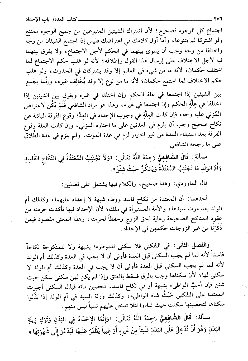 اجْتِمَاعُ كُلِّ الْوُجُوهِ فَصَحِيحٌ؛ لِأَنَّ اشْتِرَاكَ الشَّيْئَيْنِ الْمَتْبُوعَيْنِ مِنْ جَمِيعِ الْوُجُوهِ مُمْتَنِعٌ وَلَوِ اشْتَرَكَا لَمْ يَتَنَوَّعَا، وَأَمَّا أَوَّلُ كَلَامِكَ فِي اعْتِرَاضِكَ فَلَيْسَ إِذَا اجْتَمَعَ الشَّيْئَانِ مِنْ وَجْهٍ وَاخْتَلَفَا من جوه وَجَبَ أَنْ يُسَوَّى بَيْنَهُمَا فِي الْحُكْمِ لِأَجْلِ الِاجْتِمَاعِ، وَلَا يُفَرَّقُ بَيْنَهُمَا فِيهِ لِأَجْلِ الِاخْتِلَافِ عَلَى إِرْسَالِ هَذَا الْقَوْلِ وَإِطْلَاقِهِ؛ لِأَنَّهُ لَوْ غُلِّبَ حُكْمُ الِاجْتِمَاعِ لِمَا اخْتَلَفَ حُكْمَانِ؛ لِأَنَّهُ مَا مِنْ شَيْء فِي الْعَالَمِ إِلَّا وَقَدْ يشتركان في الحدوث، ولو غُلِّبَ حُكْمُ الِاخْتِلَافِ لِمَا اجْتَمَعَ حُكْمَانِ؛ لِأَنَّهُ مَا مِنْ نَوْعٍ إِلَّا وَقَدْ يُخَالِفُ غَيْرَهُ، وَإِنَّمَا يُجْمَعُ بَيْنَ الشَّيْئَيْنِ إِذَا اجْتَمَعَا فِي عِلَّةِ الْحُكْمِ وَإِنِ اخْتَلَفَا فِي غَيْرِهِ وَيُفَرَّقُ بَيْنَ الشَّيْئَيْنِ إِذَا اخْتَلَفَا فِي عِلَّةِ الْحُكْمِ وَإِنِ اجْتَمَعَا فِي غَيْرِهِ، وَهَذَا هُوَ مُرَادُ الشَّافِعِيِّ فَلَمْ يَكُنْ لِاعْتِرَاضِ الْمُزَنِيِّ عَلَيْهِ وَجْهٌ، فَإِنْ كَانَتِ الْعِلَّةُ فِي وُجُوبِ الْإِحْدَادِ فِي الْعِدَّةِ وُقُوعَ الْفُرْقَةِ الْبَائِنَةِ عَنْ نِكَاحٍ صَحِيحٍ وَجَبَ أَنْ يَلْزَمَ فِي الْعِدَّتَيْنِ عَلَى مَا اخْتَارَهُ الْمُزَنِيُّ، وَإِنْ كَانَتِ الْعِلَّةُ وُقُوعَ الْفُرْقَةِ بَعْدَ اسْتِيفَاءِ الْمُدَّةِ مِنْ غَيْرِ اخْتِيَارٍ لَزِمَ فِي عِدَّةِ الْمَوْتِ، وَلَمْ يَلْزَمْ فِي عِدَّةٍ الطَّلَاقِ عَلَى مَا رَجَّحَهُ الشَّافِعِيُّ.