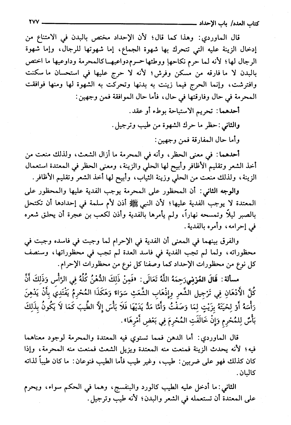 قَالَ الْمَاوَرْدِيُّ: وَهَذَا كَمَا قَالَ؛ لِأَنَّ الْإِحْدَادَ مُخْتَصٌّ بِالْبَدَنِ فِي الِامْتِنَاعِ مِنْ إِدْخَالِ الزِّينَةِ عَلَيْهِ الَّتِي تَتَحَرَّكُ بِهَا شَهْوَةُ الْجِمَاعِ، إِمَّا شَهْوَتُهَا لِلرِّجَالِ، وَإِمَّا شَهْوَةُ الرِّجَالِ لَهَا؛ لِأَنَّهُ لما حرم نكاحها ووطئها حرم دواعيها كالمحرمة ودواعيها مَا اخْتَصَّ بِالْبَدَنِ لَا مَا فَارَقَهُ مِنْ مَسْكَنٍ وَفَرْشٍ؛ لِأَنَّهُ لَا حَرَجَ عَلَيْهَا فِي اسْتِحْسَانِ مَا سَكَنَتْ وَافْتَرَشَتْ، وَإِنَّمَا الْحَرَجُ فِيمَا زَيَّنَتْ بِهِ بَدَنَهَا وَتَحَرَّكَتْ بِهِ الشَّهْوَةُ لَهَا وَمِنْهَا فَوَافَقَتِ الْمُحْرِمَةَ فِي حَالٍ وَفَارَقَتْهَا فِي حَالٍ، فَأَمَّا حَالُ الْمُوَافِقَةِ فَمِنْ وَجْهَيْنِ: