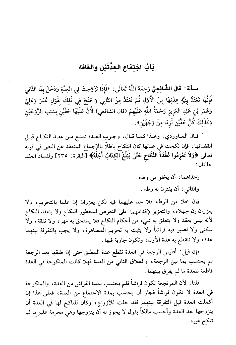 قال الشافعي رحمه الله تعالى: " فَإِذَا تَزَوَّجَتْ فِي الْعِدَّةِ وَدَخَلَ بِهَا الثَّانِي فَإِنَّهَا تَعْتَدُّ بِنِيَّةِ عِدَّتِهَا مِنَ الْأَوَّلِ ثُمَّ تَعْتَدُّ مِنَ الثَّانِي وَاحْتَجَّ فِي ذَلِكَ بِقَوْلِ عُمَرَ وَعَلِيٍّ وَعُمَرَ بْنِ عَبْدِ الْعَزِيزِ رَحْمَةُ اللَّهِ عَلَيْهِمْ (قَالَ الشَّافِعِيُّ) لَأَنَّ عَلَيْهَا حَقَّيْنِ بِسَبَبِ الزَّوْجَيْنِ وَكَذَلِكَ كُلُّ حَقَّيْنِ لَزِمَا مِنْ وَجْهَيْنِ ".