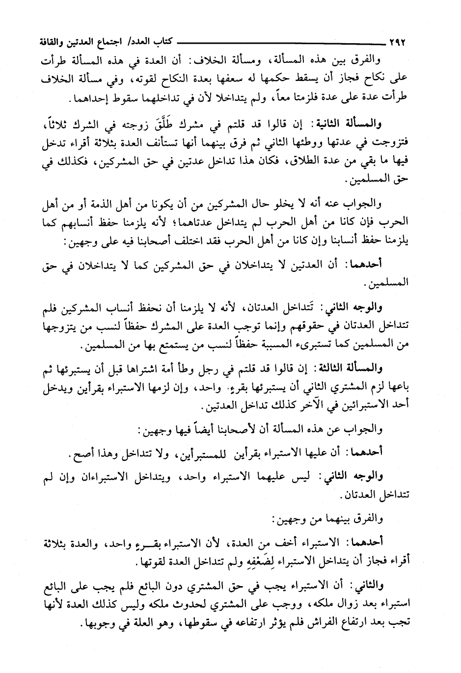 وَالْوَجْهُ الثَّانِي: تَتَدَاخَلُ الْعِدَّتَانِ، لِأَنَّهُ لَا يَلْزَمُنَا أَنْ نَحْفَظَ أَنْسَابَ الْمُشْرِكِينَ فَلَمْ تَتَدَاخَلِ الْعِدَّتَانِ فِي حُقُوقِهِمْ وَإِنَّمَا تُوجَبُ الْعِدَّةُ عَلَى الْمُشْرِكِ حِفْظًا لِنَسَبِ مَنْ يَتَزَوَّجُهَا مِنَ الْمُسْلِمِينَ كَمَا تَسْتَبْرِئُ المسببة حِفْظًا لِنَسَبِ مَنْ يَسْتَمْتِعُ بِهَا مِنَ الْمُسْلِمِينَ.