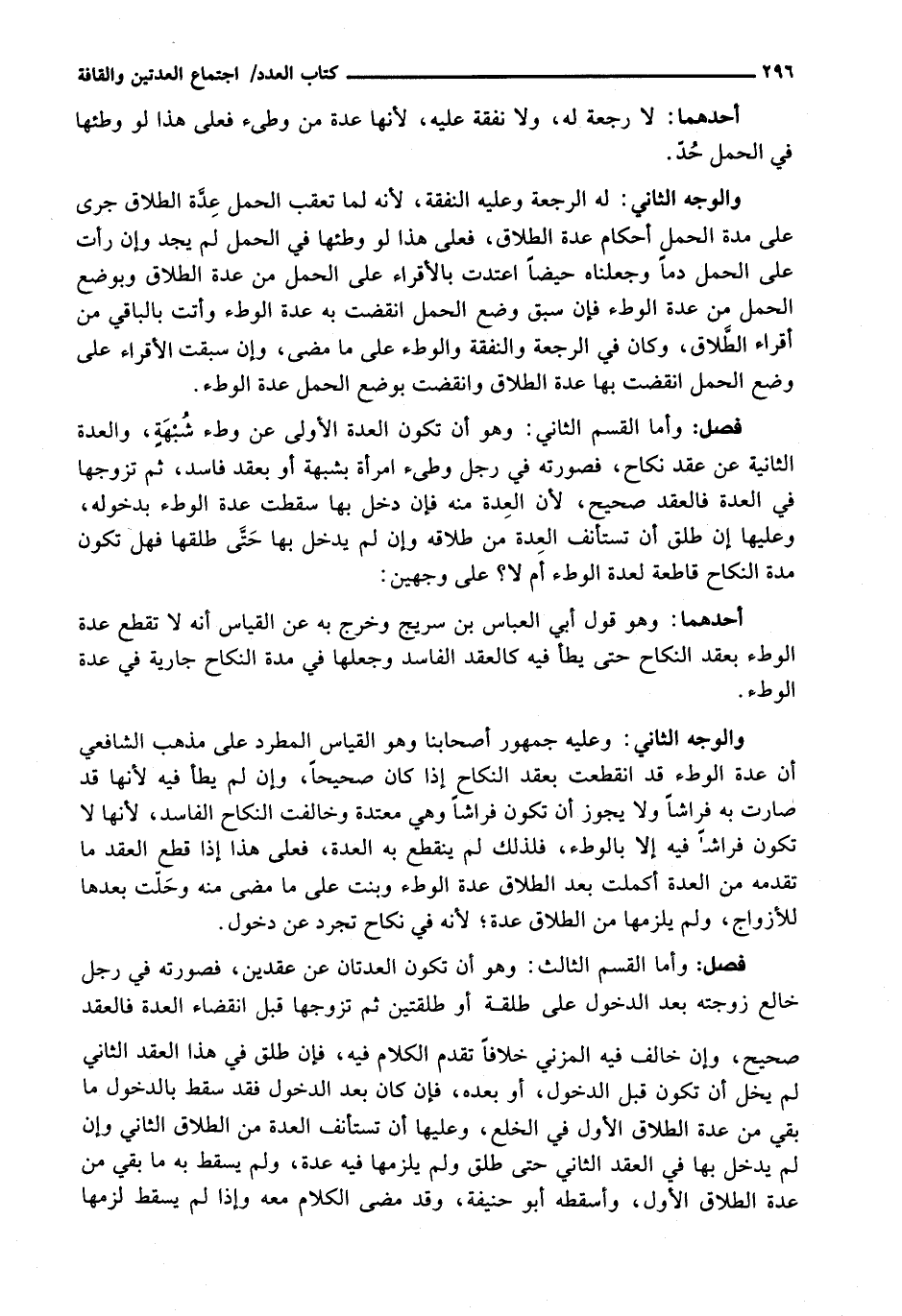 أَحَدُهُمَا: وَهُوَ قَوْلُ أَبِي الْعَبَّاسِ بْنِ سُرَيْجٍ وَخَرَجَ بِهِ عَنِ الْقِيَاسِ أَنَّهُ لَا تُقْطَعُ عِدَّةُ الْوَطْءِ بِعَقْدِ النِّكَاحِ حَتَّى يَطَأَ فِيهِ كَالْعَقْدِ الْفَاسِدِ وَجَعَلَهَا فِي مُدَّةِ النِّكَاحِ جَارِيَةً فِي عِدَّةِ الْوَطْءِ.