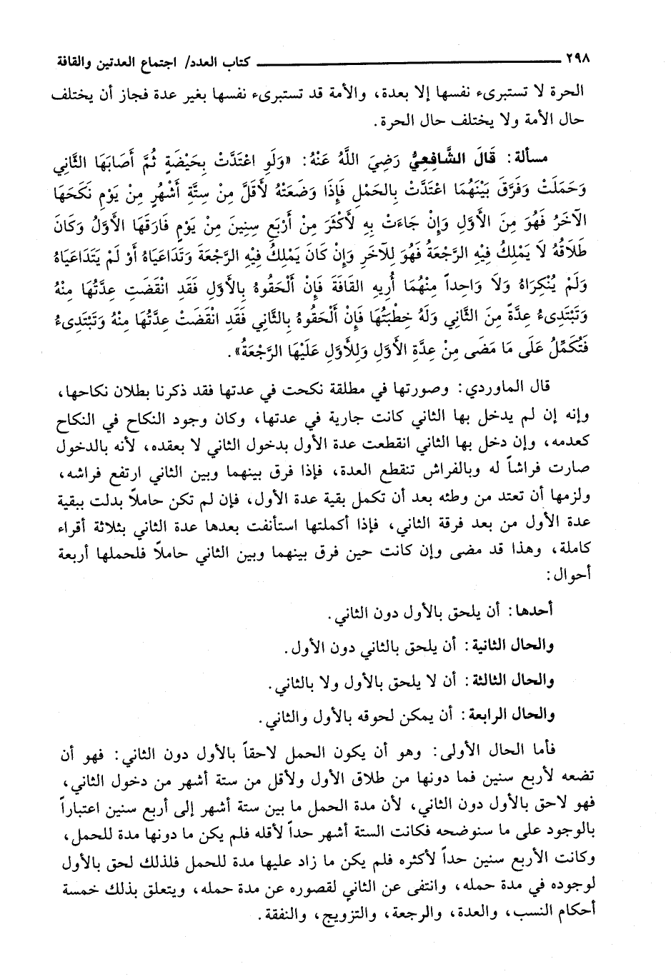 قال الشافعي رضي الله عنه: " وَلَوِ اعْتَدَّتْ بِحَيْضَةٍ ثُمَّ أَصَابَهَا الثَّانِي وَحَمَلَتْ وَفُرِّقَ بَيْنَهُمَا اعْتَدَّتْ بِالْحَمْلِ فَإِذَا وَضَعَتْهُ لِأَقَلَّ مِنْ سِتَّةِ أَشْهُرٍ مِنْ يَوْمِ نَكَحَهَا الْآخَرُ فهو من الأول وإن جاءت به لأكثر من أربع سنين من يوم فارقها الأول وكان طلاقه لا يملك فيه الرجعة فهو للآخر وإن كان يملك فيه الرجعة وتداعياه أو لم يتداعياه ولم ينكراه ولا واحداً منهما أريه القافة فإن ألحقوه بالأول فقد انقضت عدتها منه وتبتدئ عدة من الثاني وله خطبتها فإن ألحقوه بالثاني فقد انقضت عدتها منه وتبتدئ فتكمل على ما مض من عدة الأول وللأول عليها الرجعة ". قَالَ الْمَاوَرْدِيُّ: وَصُورَتُهَا فِي مُطَلَّقَةٍ نَكَحَتْ فِي عدتها فقد ذكرنا بطلان نكاحها، وأنهإ إِنْ لَمْ يَدْخُلْ بِهَا الثَّانِي كَانَتْ جَارِيَةً فِي عِدَّتِهَا، وَكَانَ وُجُودُ النِّكَاحِ فِي النِّكَاحِ كَعَدَمِهِ، وَإِنْ دَخَلَ بِهَا الثَّانِي انْقَطَعَتْ عِدَّةُ الْأَوَّلِ بِدُخُولِ الثَّانِي لَا بِعَقْدِهِ، لِأَنَّهُ بِالدُّخُولِ صَارَتْ فِرَاشًا لَهُ وَبِالْفِرَاشِ تَنْقَطِعُ الْعِدَّةُ، فَإِذَا فراق بَيْنَهُمَا وَبَيْنَ الثَّانِي ارْتَفَعَ فِرَاشُهُ، وَلَزِمَهَا أَنْ تَعْتَدَّ مِنْ وَطْئِهِ بَعْدَ أَنْ تُكْمِلَ بَقِيَّةَ عِدَّةِ الْأَوَّلِ، فَإِنْ لَمْ تَكُنْ حَامِلًا بَدَّلَتْ بِبَقِيَّةِ عِدَّةِ الْأَوَّلِ مِنْ بَعْدِ فُرْقَةِ الثَّانِي، فَإِذَا أَكْمَلَتْهَا اسْتَأْنَفَتْ بَعْدَهَا عِدَّةَ الثَّانِي بِثَلَاثَةِ أَقْرَاءٍ كَامِلَةٍ، وَهَذَا قَدْ مَضَى وَإِنْ كَانَتْ حِينَ فُرِّقَ بَيْنَهُمَا وَبَيْنَ الثَّانِي حَامِلًا فَلِحَمْلِهَا أَرْبَعَةُ أَحْوَالٍ: