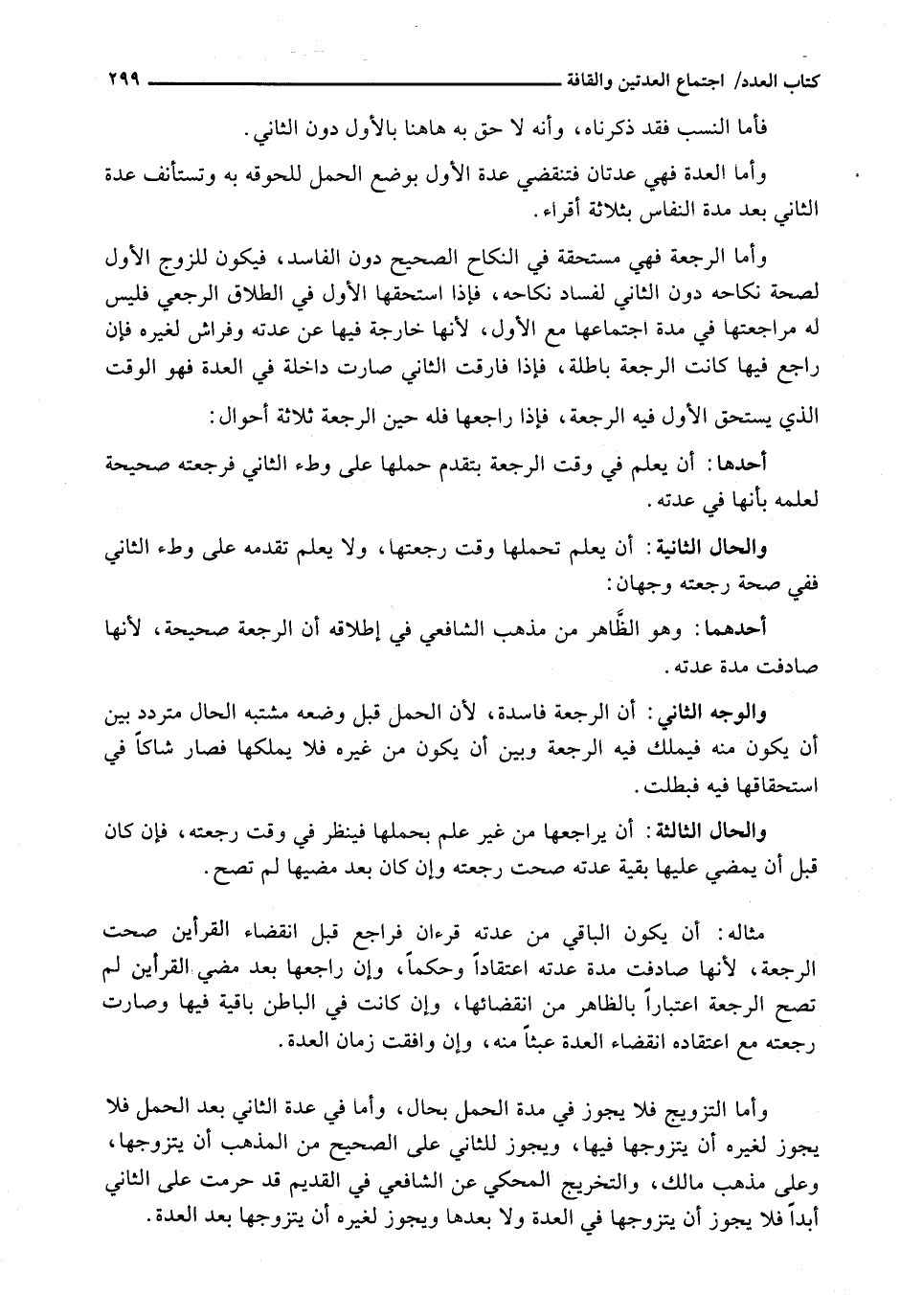أَحَدُهَا: أَنْ يَعْلَمَ فِي وَقْتِ الرَّجْعَةِ بِتَقَدُّمِ حَمْلِهَا عل وَطْءِ الثَّانِي فَرَجْعَتُهُ صَحِيحَةٌ لِعِلْمِهِ بِأَنَّهَا فِي عِدَّتِهِ وَالْحَالُ الثَّانِيَةُ، أَنْ يَعْلَمَ تَحَمُّلَهَا وَقْتَ رَجْعَتِهَا، وَلَا يَعْلَمَ تَقَدُّمَهُ عَلَى وَطْءِ الثَّانِي فَفِي صِحَّةِ رَجْعَتِهِ وَجْهَانِ: