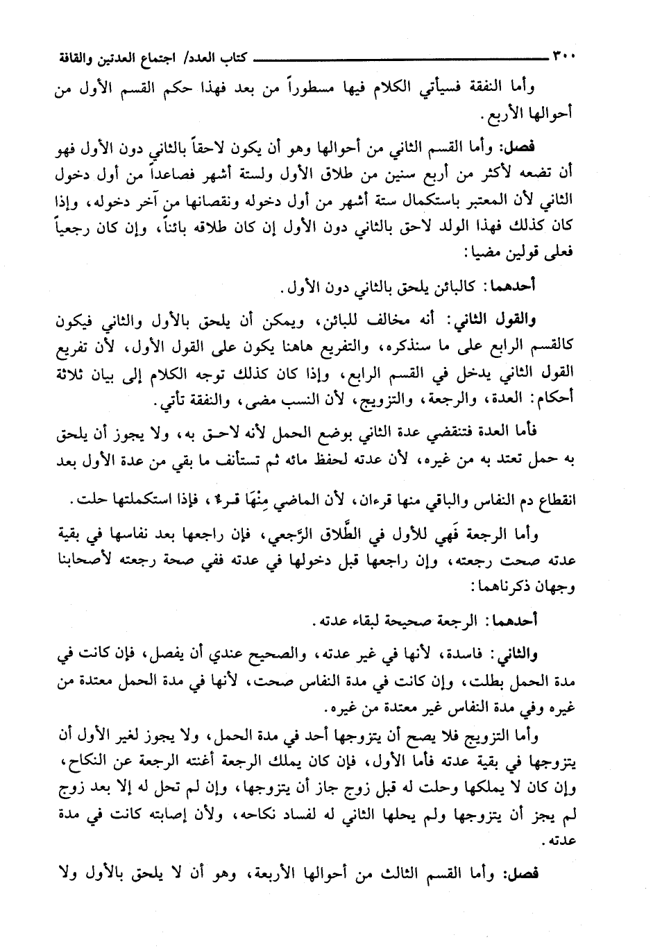 وَالْقَوْلُ الثَّانِي: أَنَّهُ مُخَالِفٌ لِلْبَائِنِ، وَيُمْكِنُ أَنْ يُلْحَقَ بِالْأَوَّلِ وَالثَّانِي فَيَكُونَ كَالْقِسْمِ الرَّابِعِ عَلَى مَا سَنَذْكُرُهُ، وَالتَّفْرِيعُ هَاهُنَا يَكُونُ عَلَى الْقَوْلِ الْأَوَّلِ، لِأَنَّ تَفْرِيعَ الْقَوْلِ الثَّانِي يَدْخُلُ فِي الْقِسْمِ الرَّابِعِ، وَإِذَا كَانَ كَذَلِكَ تَوَجَّهَ الْكَلَامُ إِلَى بَيَانِ ثَلَاثَةِ أَحْكَامٍ: الْعِدَّةُ، وَالرَّجْعَةُ، وَالتَّزْوِيجُ، لِأَنَّ النَّسَبَ مَضَى، وَالنَّفَقَةَ تَأْتِي.