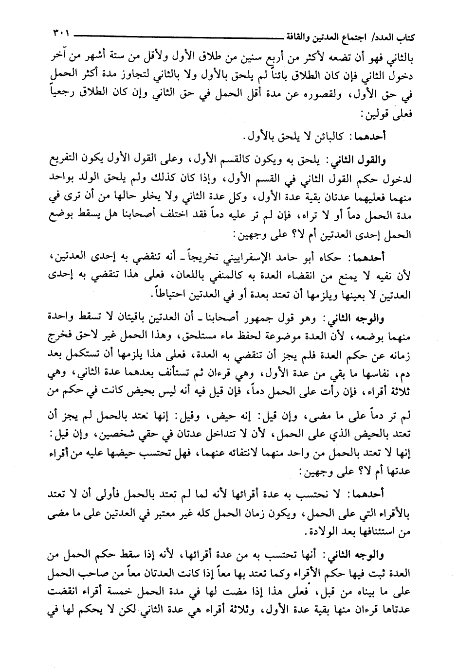 أَحَدُهُمَا: لا نحتسب بِهِ عِدَّةَ أَقْرَائِهَا لِأَنَّهُ لَمَّا لَمْ تَعْتَدَّ بِالْحَمْلِ فَأَوْلَى أَنْ لَا تَعْتَدَّ بِالْأَقْرَاءِ الَّتِي عَلَى الْحَمْلِ، وَيَكُونُ زَمَانُ الْحَمْلِ كُلُّهُ غَيْرُ مُعْتَبَرٍ فِي الْعِدَّتَيْنِ عَلَى مَا مَضَى مِنِ اسْتِئْنَافِهَا بَعْدَ الْوِلَادَةِ.