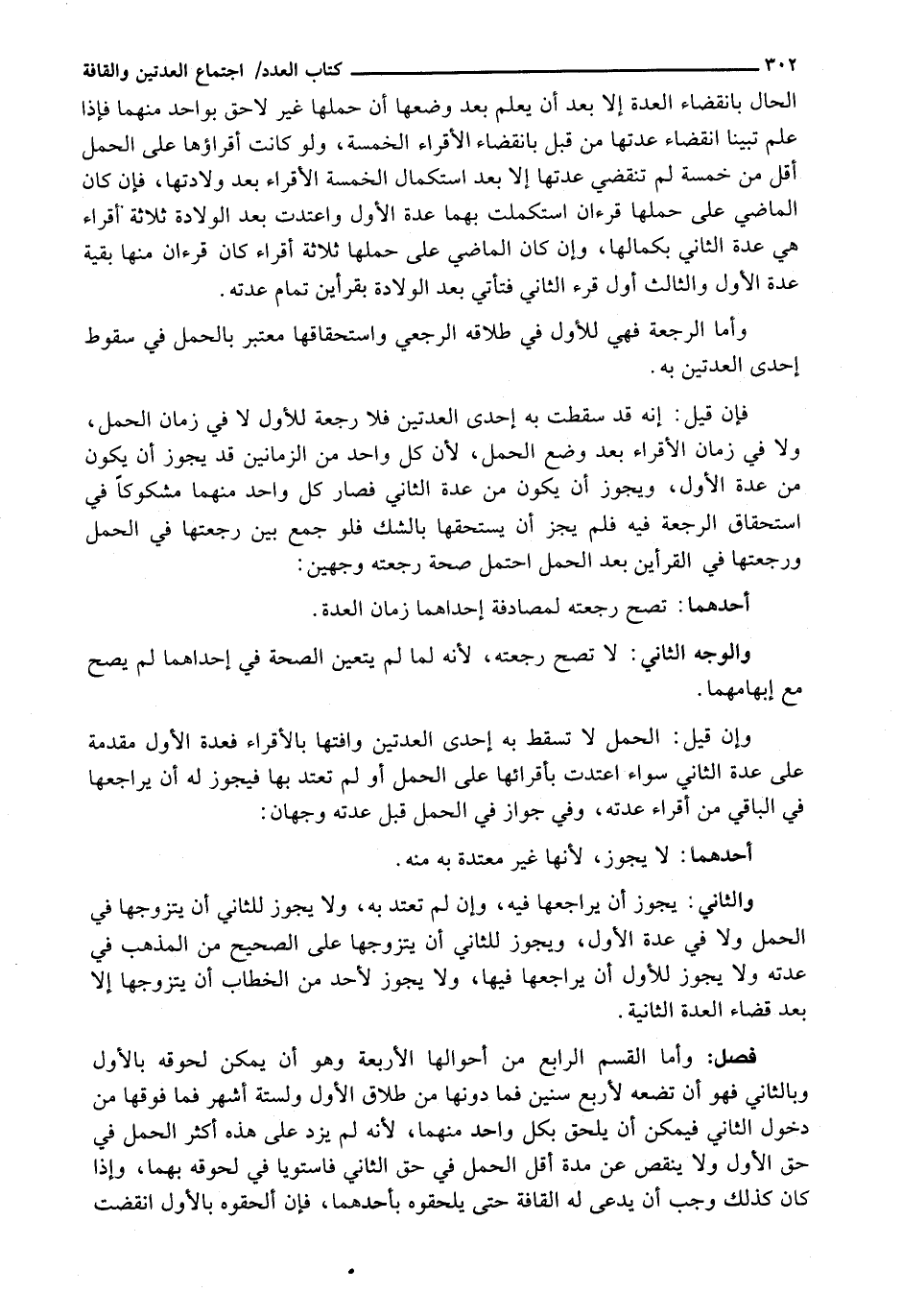 فَإِنْ قِيلَ: إِنَّهُ قَدْ سَقَطَتْ بِهِ إِحْدَى الْعِدَّتَيْنِ فَلَا رَجْعَةَ لِلْأَوَّلِ لَا فِي زَمَانِ الْحَمْلِ، وَلَا فِي زَمَانِ الْأَقْرَاءِ بَعْدَ وَضْعِ الْحَمْلِ، لِأَنَّ كُلَّ وَاحِدٍ مِنَ الزَّمَانَيْنِ قَدْ يَجُوزُ أَنْ يَكُونَ مِنْ عِدَّةِ الْأَوَّلِ، وَيَجُوزُ أَنْ يَكُونَ مِنْ عِدَّةِ الثَّانِي فَصَارَ كُلُّ وَاحِدٍ مِنْهُمَا مَشْكُوكًا فِي اسْتِحْقَاقِ الرَّجْعَةِ فِيهِ فَلَمْ يَجُزْ أَنْ يَسْتَحِقَّهَا بِالشَّكِّ فَلَوْ جَمَعَ بَيْنَ رَجْعَتِهَا فِي الْحَمْلِ وَرَجْعَتِهَا فِي الْقُرْأَيْنِ بَعْدَ الْحَمْلِ احْتَمَلَ صِحَّةُ رَجْعَتِهِ وَجْهَيْنِ: