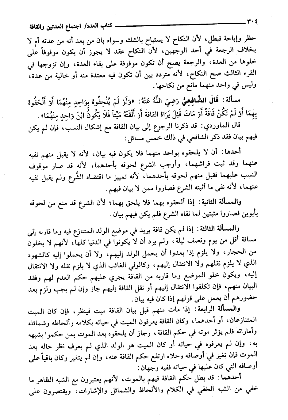 قَالَ الْمَاوَرْدِيُّ: قَدْ ذَكَرْنَا الرُّجُوعَ إِلَى بَيَانِ الْقَافَةِ مَعَ إِشْكَالِ النَّسَبِ، فَإِنْ لَمْ يَكُنْ فِيهِمْ بَيَانٌ فَقَدْ ذَكَرَ الشَّافِعِيُّ فِي ذَلِكَ خَمْسَ مَسَائِلَ: