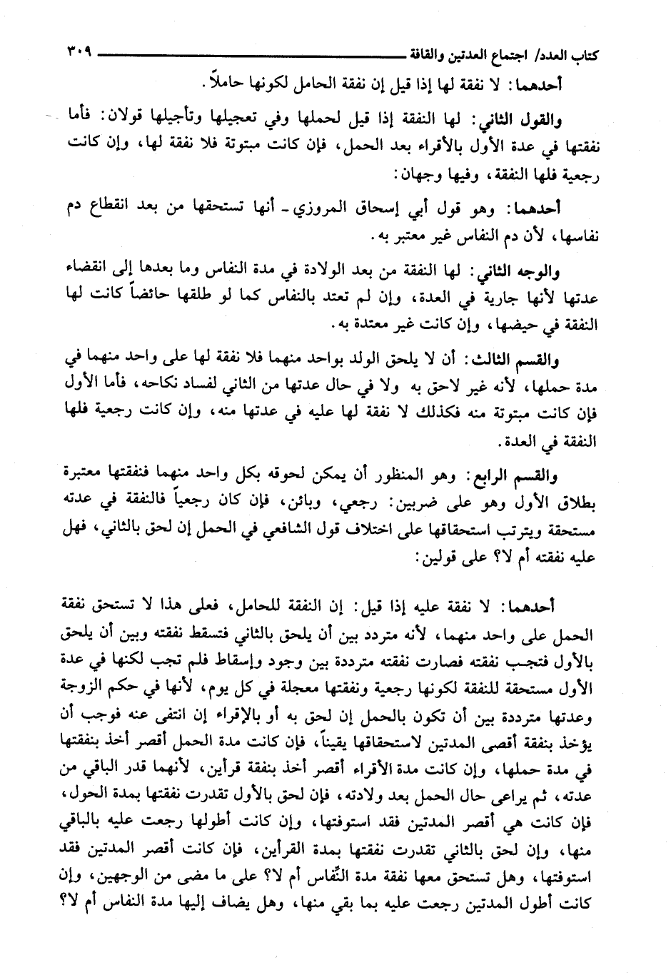 وَالْقِسْمُ الرَّابِعُ: وَهُوَ الْمَنْظُورُ أَنْ يُمْكِنَ لُحُوقُهُ بِكُلِّ وَاحِدٍ مِنْهُمَا فَنَفَقَتُهَا مُعْتَبَرَةٌ بِطَلَاقِ الْأَوَّلِ وَهُوَ عَلَى ضَرْبَيْنِ: رَجْعِيٍّ، وَبَائِنٍ فَإِنْ كَانَ رَجْعِيًّا فَالنَّفَقَةُ فِي عِدَّتِهِ مُسْتَحَقَّةٌ وَيَتَرَتَّبُ اسْتِحْقَاقُهَا عَلَى اخْتِلَافِ قَوْلِ الشَّافِعِيِّ فِي الْحَمْلِ إِنْ لَحِقَ بِالثَّانِي، فَهَلْ عَلَيْهِ نَفَقَتُهُ أَمْ لَا؟ عَلَى قَوْلَيْنِ: