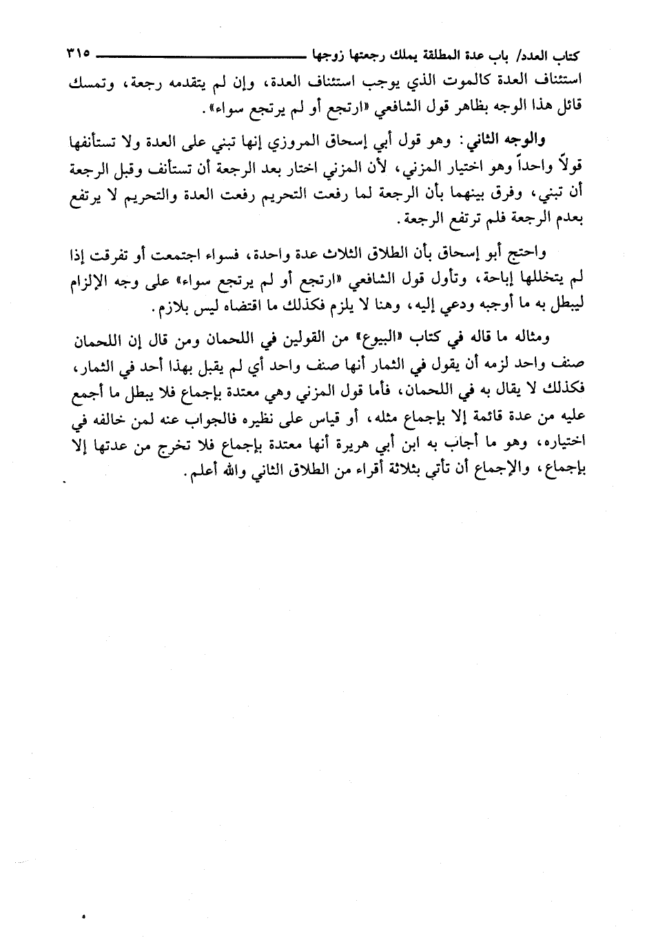 وَمِثَالُهُ مَا قَالَهُ فِي كِتَابِ " الْبُيُوعِ " مِنَ الْقَوْلَيْنِ فِي اللُّحْمَانِ وَمَنْ قَالَ إِنَّ اللُّحْمَانَ صِنْفٌ وَاحِدُ لَزِمَهُ أَنْ يَقُولَ فِي الثِّمَارِ أَنَّهَا صِنْفٌ وَاحِدٌ أَيْ لَمْ يَقْبَلْ بِهَذَا أَحَدٌ فِي الثِّمَارِ، فَكَذَلِكَ لَا يُقَالُ بِهِ فِي اللُّحْمَانِ، فَأَمَّا قَوْلُ الْمُزَنِيِّ وَهِيَ مُعْتَدَّةٌ بِإِجْمَاعٍ فَلَا يَبْطُلُ مَا أُجْمِعَ عَلَيْهِ مِنْ عِدَّةٍ قَائِمَةٍ إِلَّا بِإِجْمَاعٍ مِثْلِهِ، أَوْ قِيَاسٍ عَلَى نَظِيرِهِ فَالْجَوَابُ عَنْهُ لِمَنْ خَالَفَهُ فِي اخْتِيَارِهِ، وَهُوَ مَا أَجَابَ بِهِ ابْنُ أَبِي هُرَيْرَةَ أَنَّهَا مُعْتَدَّةٌ بِإِجْمَاعٍ فَلَا تَخْرُجُ مِنْ عِدَّتِهَا إِلَّا بِإِجْمَاعٍ، وَالْإِجْمَاعُ أَنْ تَأْتِيَ بِثَلَاثَةِ أَقْرَاءٍ مِنَ الطَّلَاقِ الثَّانِي وَاللَّهُ أعلم.
