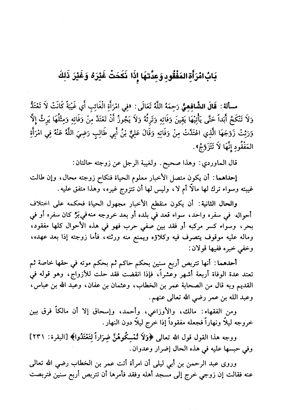 قال الشافعي رحمه الله تعالى: " فِي امْرَأَةِ الْغَائِبِ أَيَّ غَيْبَةٍ كَانَتْ لَا تَعْتَدُّ وَلَا تَنْكِحُ أَبَدًا حَتَّى يَأْتِيَهَا يَقِينُ وفاته وترثه ولا يجوز أن تعتد من وفاته ومثلها يرث إلا ورثت زوجها الذي اعتدت من وفاته وَقَالَ عَلِيُّ بْنُ أَبِي طَالِبٍ رَضِيَ اللَّهُ عنه في امرأة المفقود إنها لا تتزوج ".